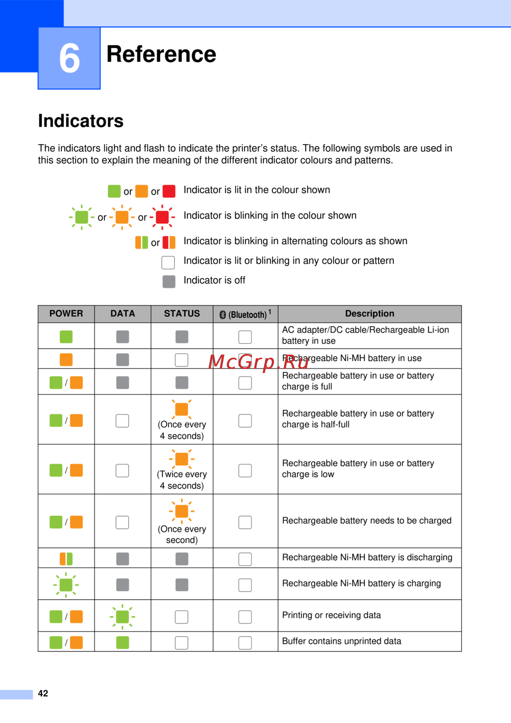 - The indicators light and flash to indicate the printer s status the following symbols are used in this section to explain the meaning of the different indicator colours and patterns p.46