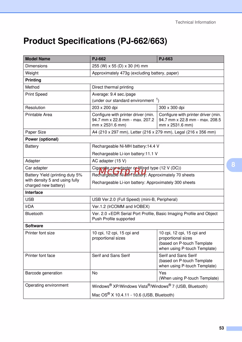 Brother PJ-662 [57/61] Product specifications pj 662 663