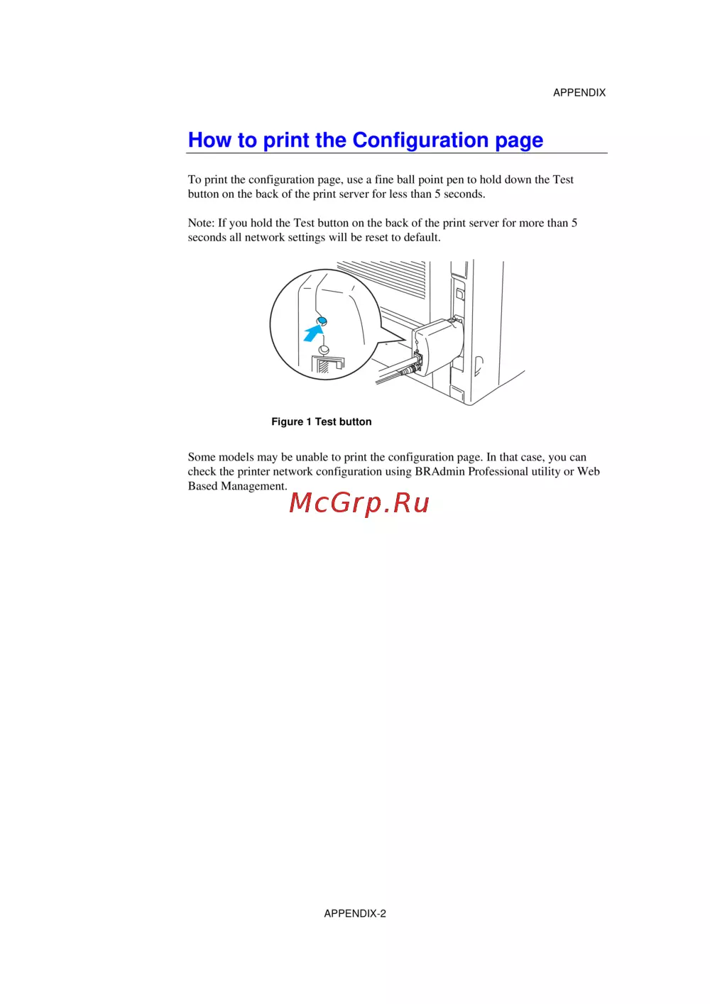 Note: If you hold the Test button on the back of the print server for more than 5