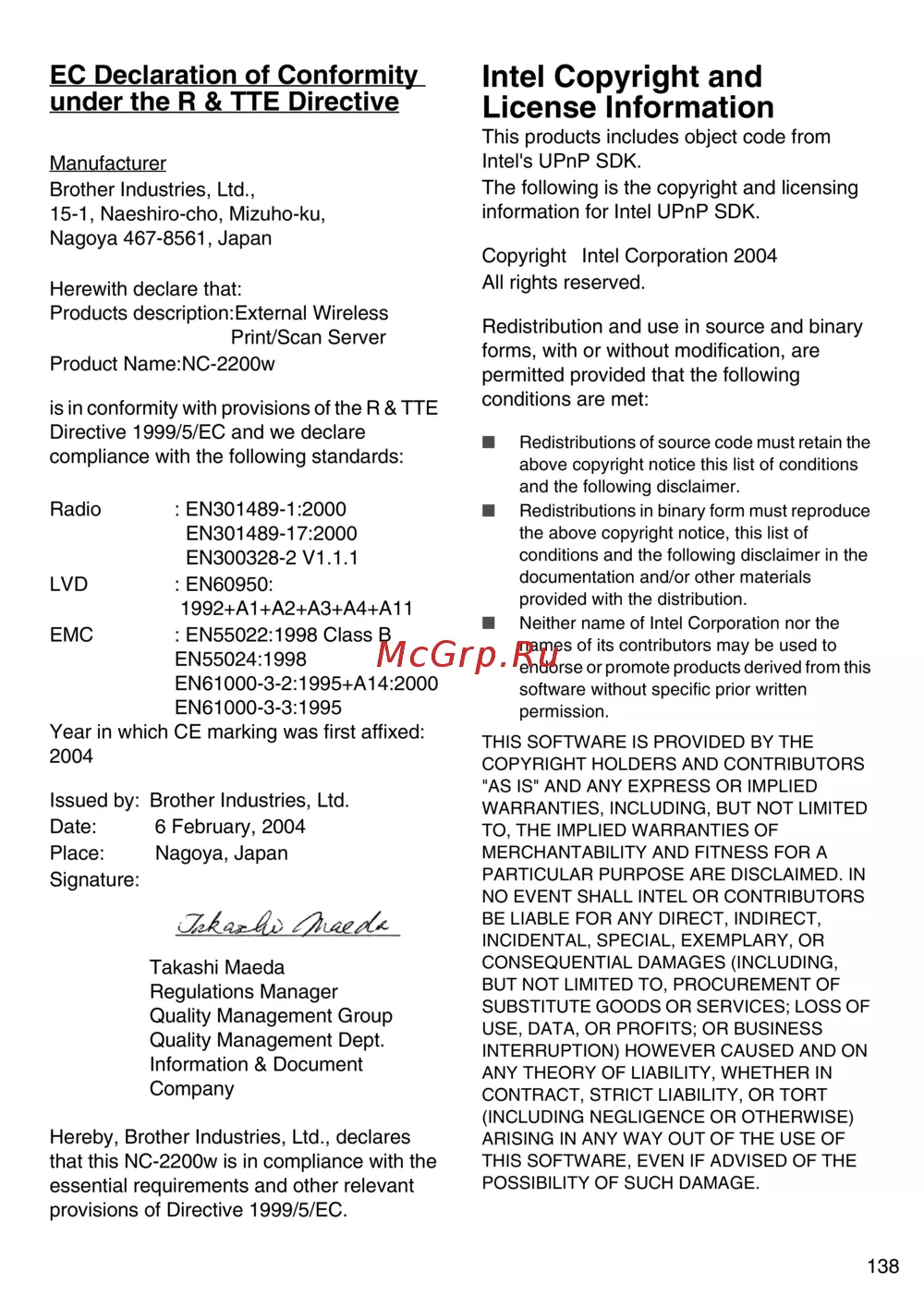 Brother NC-2200w [139/159] Ec declaration of conformity under the r tte directive