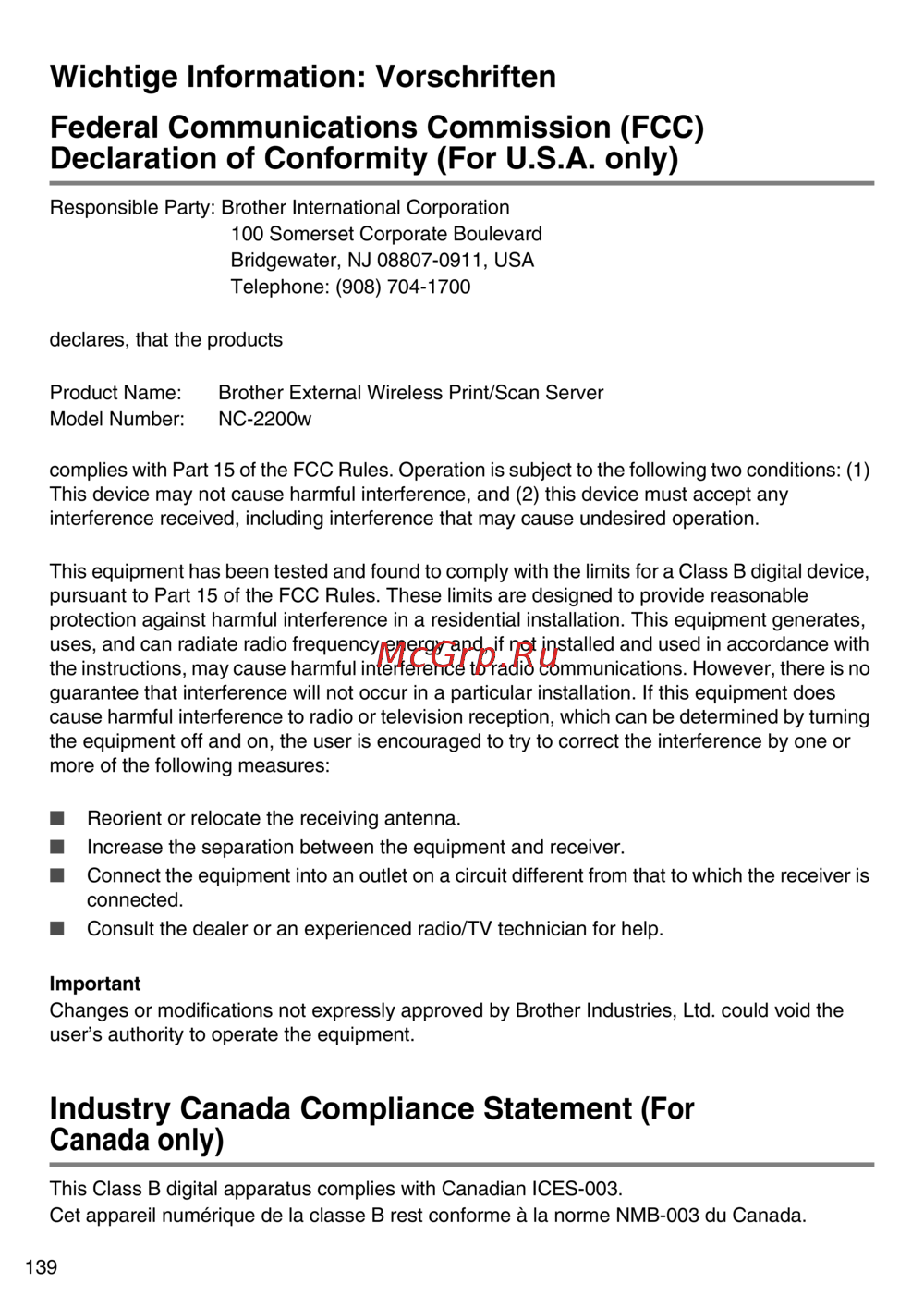 Brother NC-2200w — wichtige Informationen zur FCC-Konformität und Gerätesicherheit [140/159]