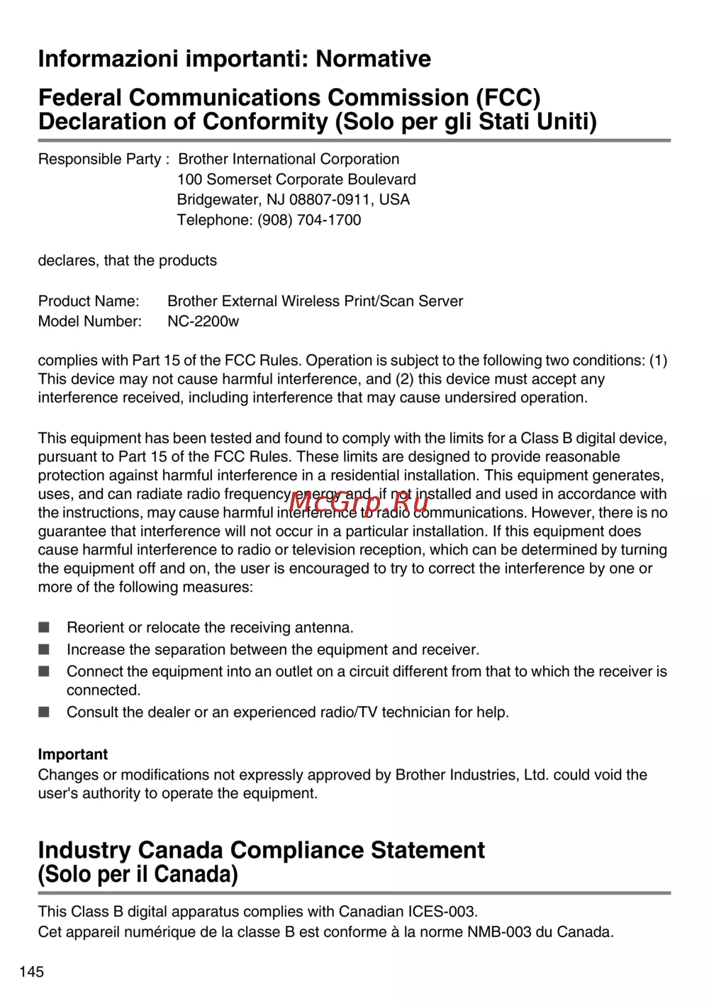 Brother NC-2200w — informazioni sulla conformità FCC e IC per dispositivi wireless [146/159]