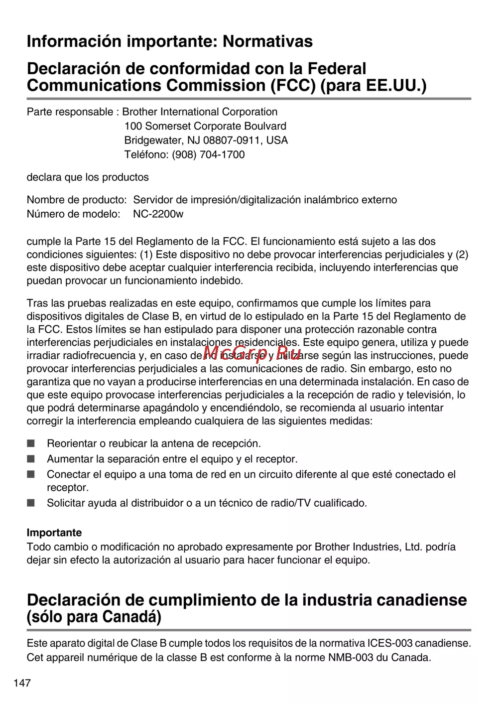 Brother NC-2200w — información sobre cumplimiento normativo de dispositivos inalámbricos [148/159]