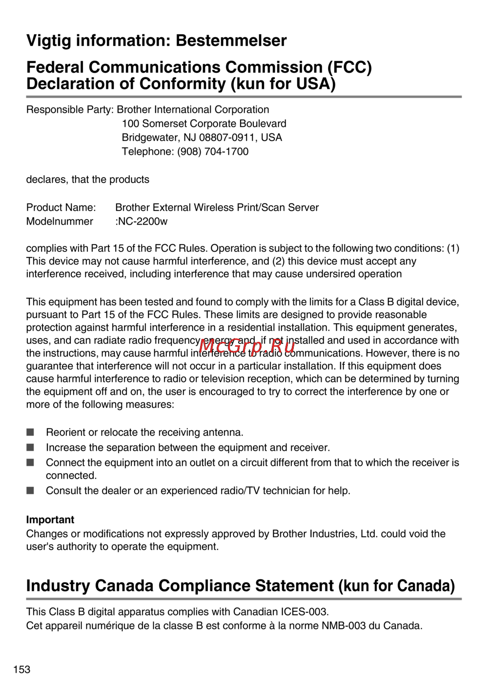 Brother NC-2200w — vigtig information om overholdelse af FCC og ICES-003 [154/159]