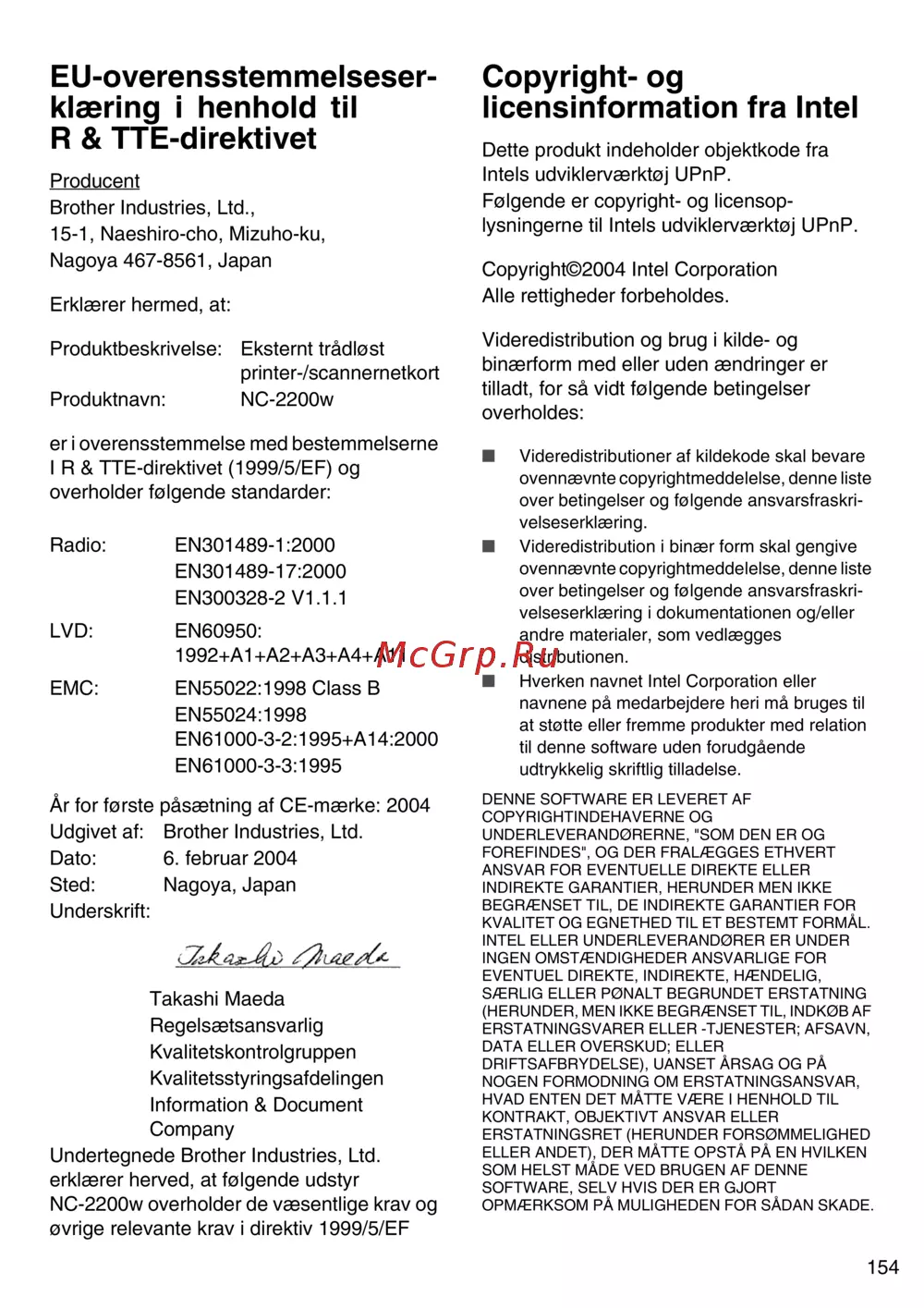 Brother NC-2200w [155/159] Eu overensstemmelseser klæring i henhold til r tte direktivet