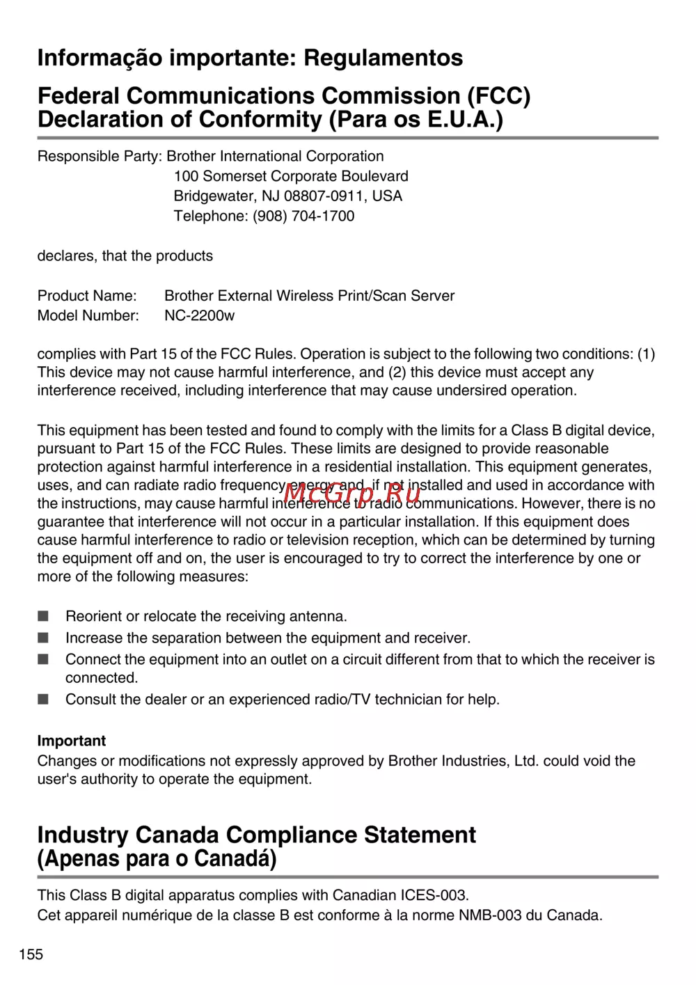 Brother NC-2200w — importante Informação sobre Conformidade e Regulamentos de Equipamentos [156/159]