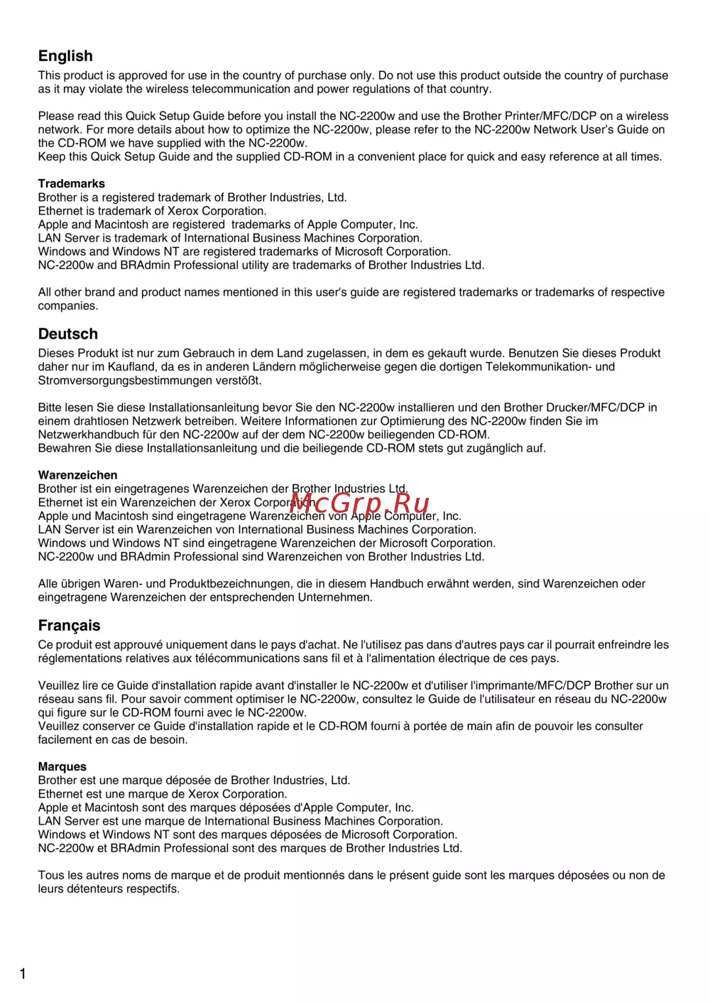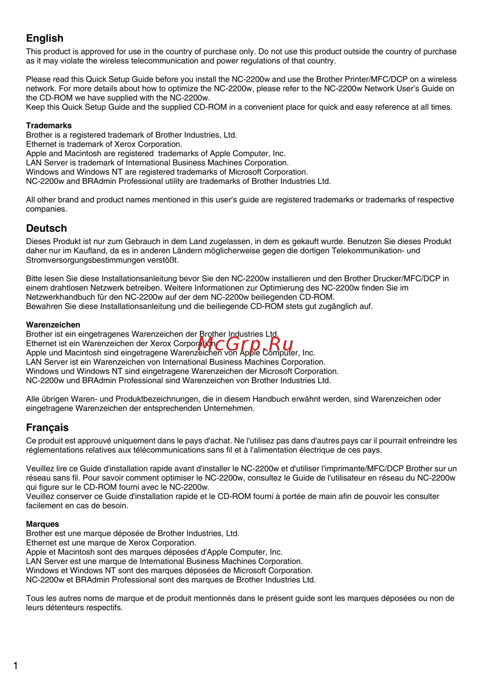 Please read this Quick Setup Guide before you install the NC-2200w and use the Brother Printer/MFC/DCP on a wireless