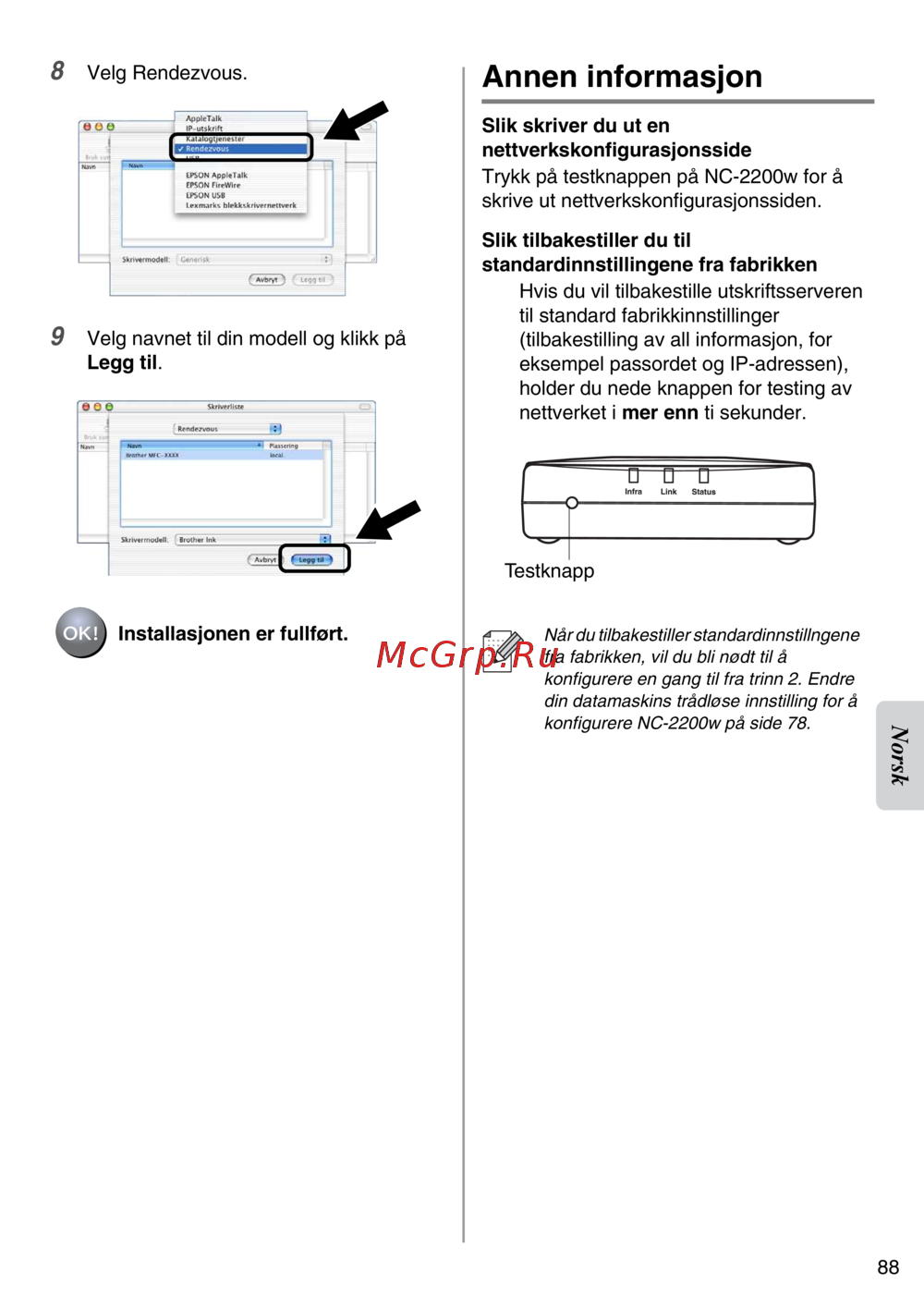 Brother NC-2200w — guide til installasjon og tilbakestilling av utskriftsservere [89/159]