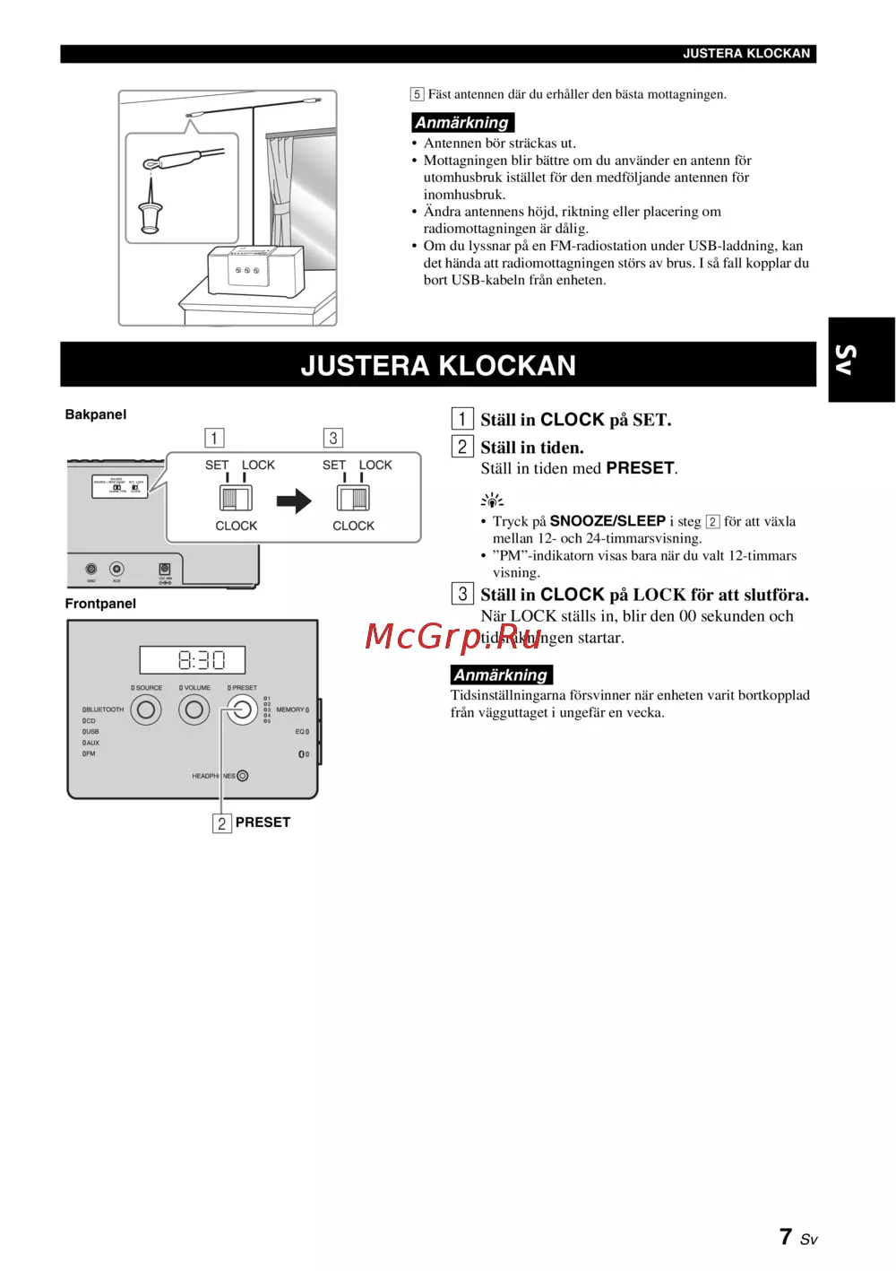 Yamaha TSX-B141 Champagne — så här ställer du in klockan och förbättrar radiomottagningen [101/248]