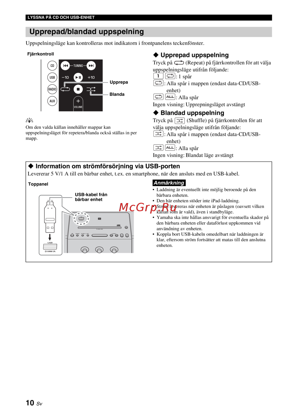 Lär dig hur du kontrollerar uppspelningslägen för CD och USB-enheter. Få information om upprepad och blandad uppspelning samt strömförsörjning via USB.