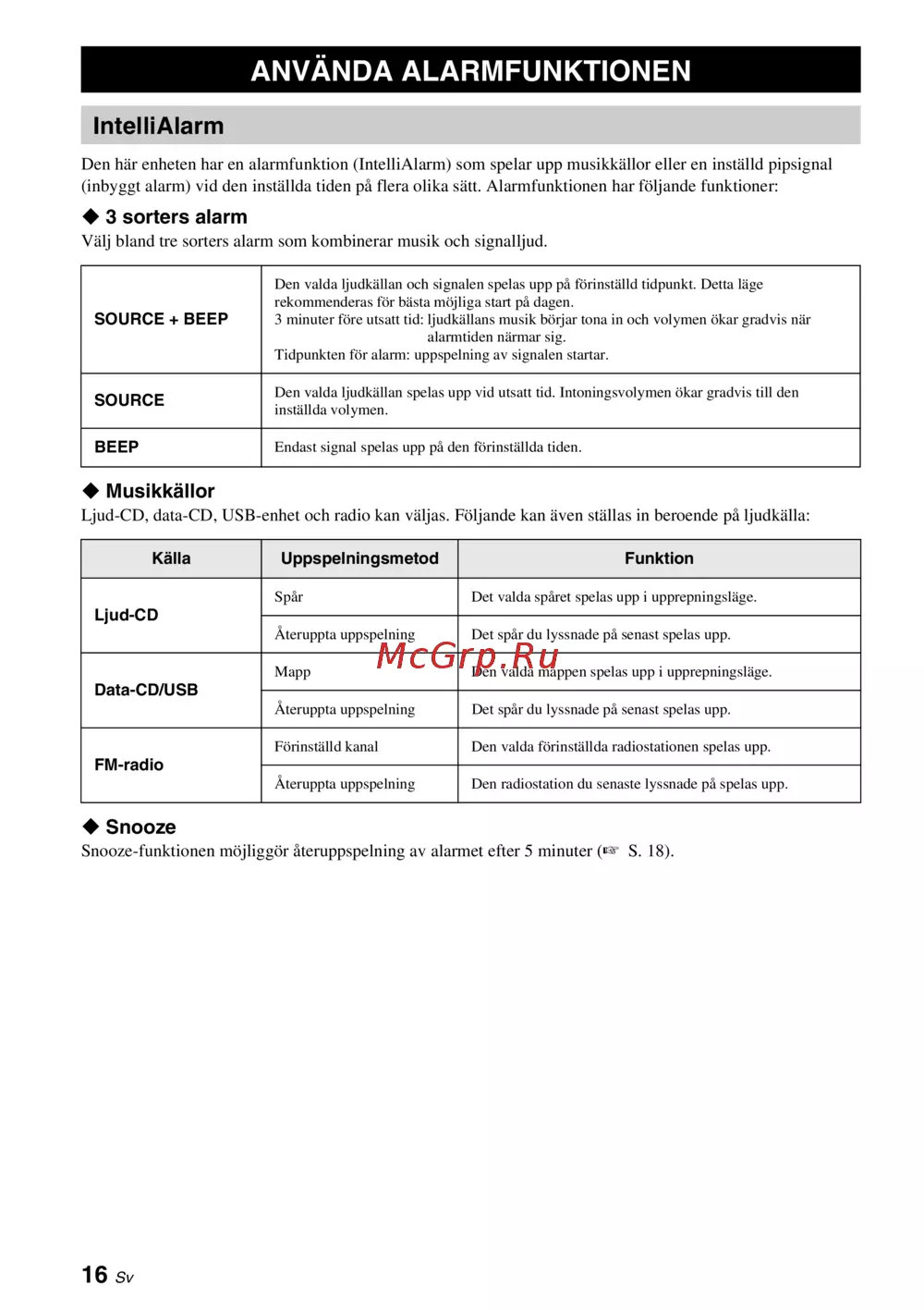 Den här enheten har en alarmfunktion (IntelliAlarm) som spelar upp musikkällor eller en inställd pipsignal