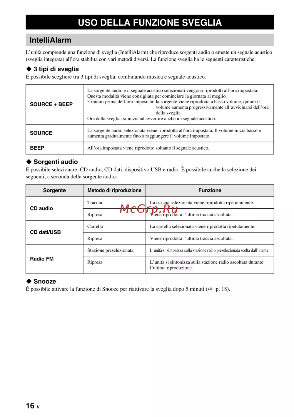 - The unit includes an alarm function intellialarm that plays back music sources or set of beeps built in alarm at the set time in a variety of different methods the alarm function has following features p.20