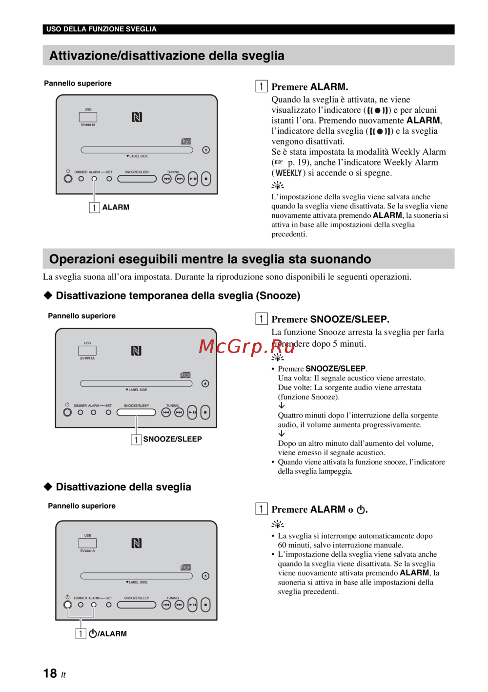 - Функцию повторения сигнала можно активировать для воспроизведения сигнала будильника через 5 минут стр 18 p.230