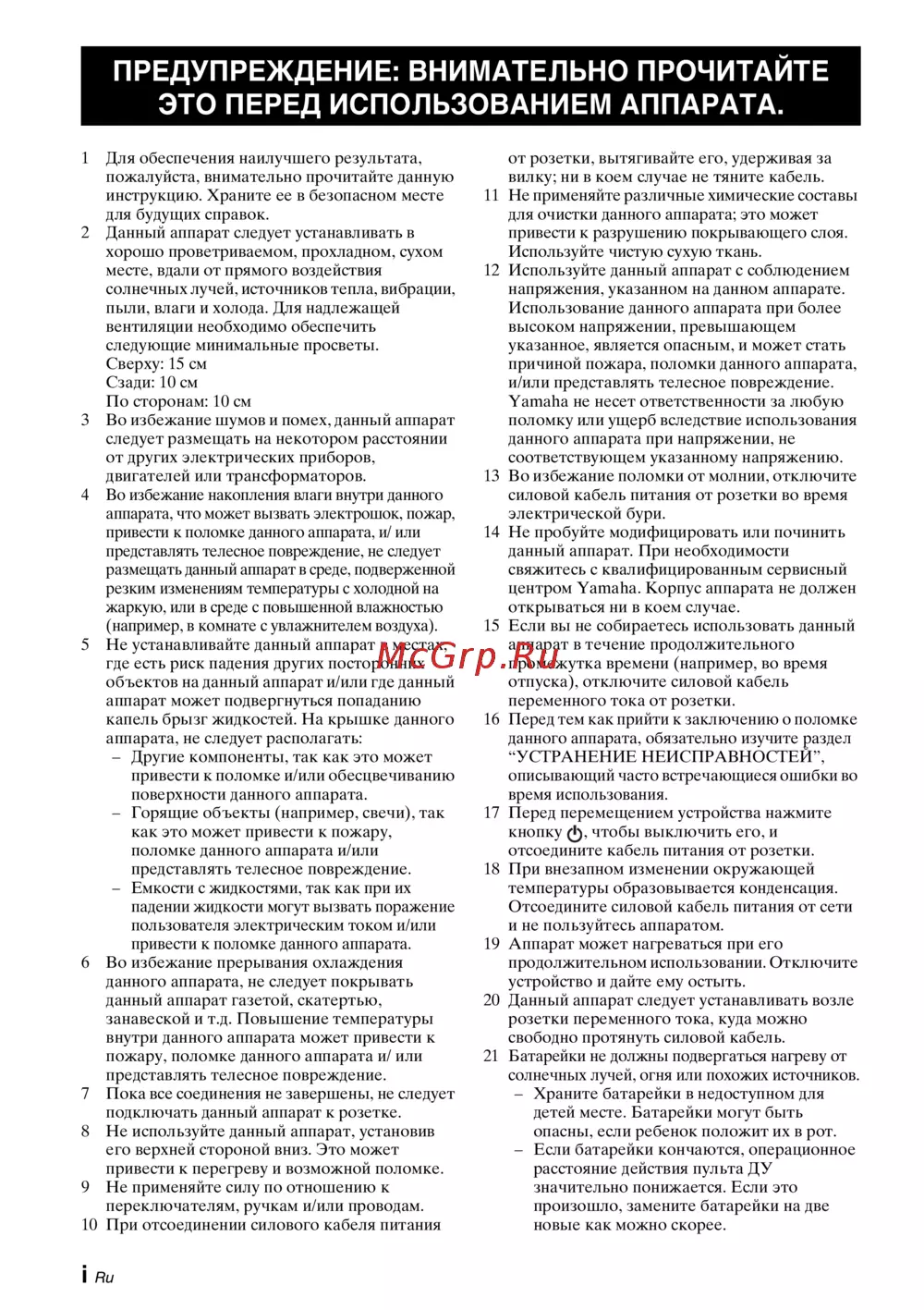 - В случае возникновения проблем при использовании устройства сначала обратитесь к следующему списку если ваша проблема не указана в таблице или приведенные ниже инструкции не помогли выключите аппарат отсоедините силовой кабель и обратитесь к ближайшему авторизованному дилеру или в сервисный центр yamaha p.236