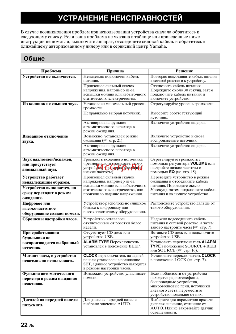 - В случае возникновения проблем при использовании устройства сначала обратитесь к следующему списку если ваша проблема не указана в таблице или приведенные ниже инструкции не помогли выключите аппарат отсоедините силовой кабель и обратитесь к ближайшему авторизованному дилеру или в сервисный центр yamaha p.236