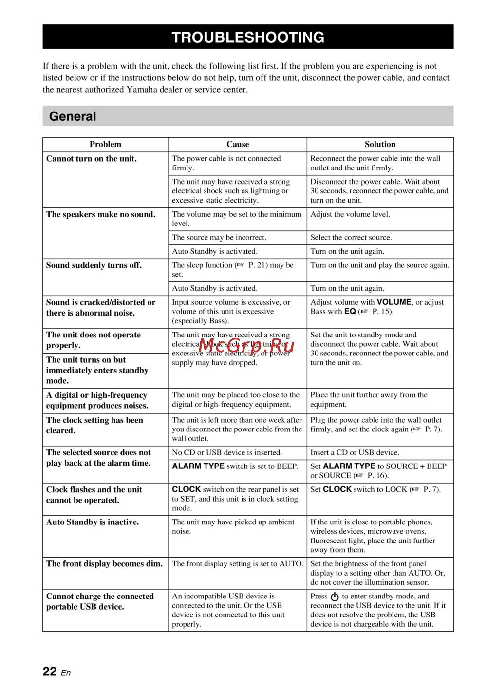 - В случае возникновения проблем при использовании устройства сначала обратитесь к следующему списку если ваша проблема не указана в таблице или приведенные ниже инструкции не помогли выключите аппарат отсоедините силовой кабель и обратитесь к ближайшему авторизованному дилеру или в сервисный центр yamaha p.236