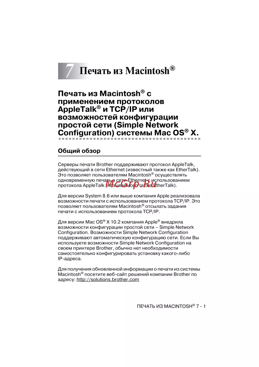 Узнайте, как осуществлять печать из систем Macintosh с использованием протоколов AppleTalk и TCP/IP. Поддержка автоматической конфигурации сети для удобства пользователей.