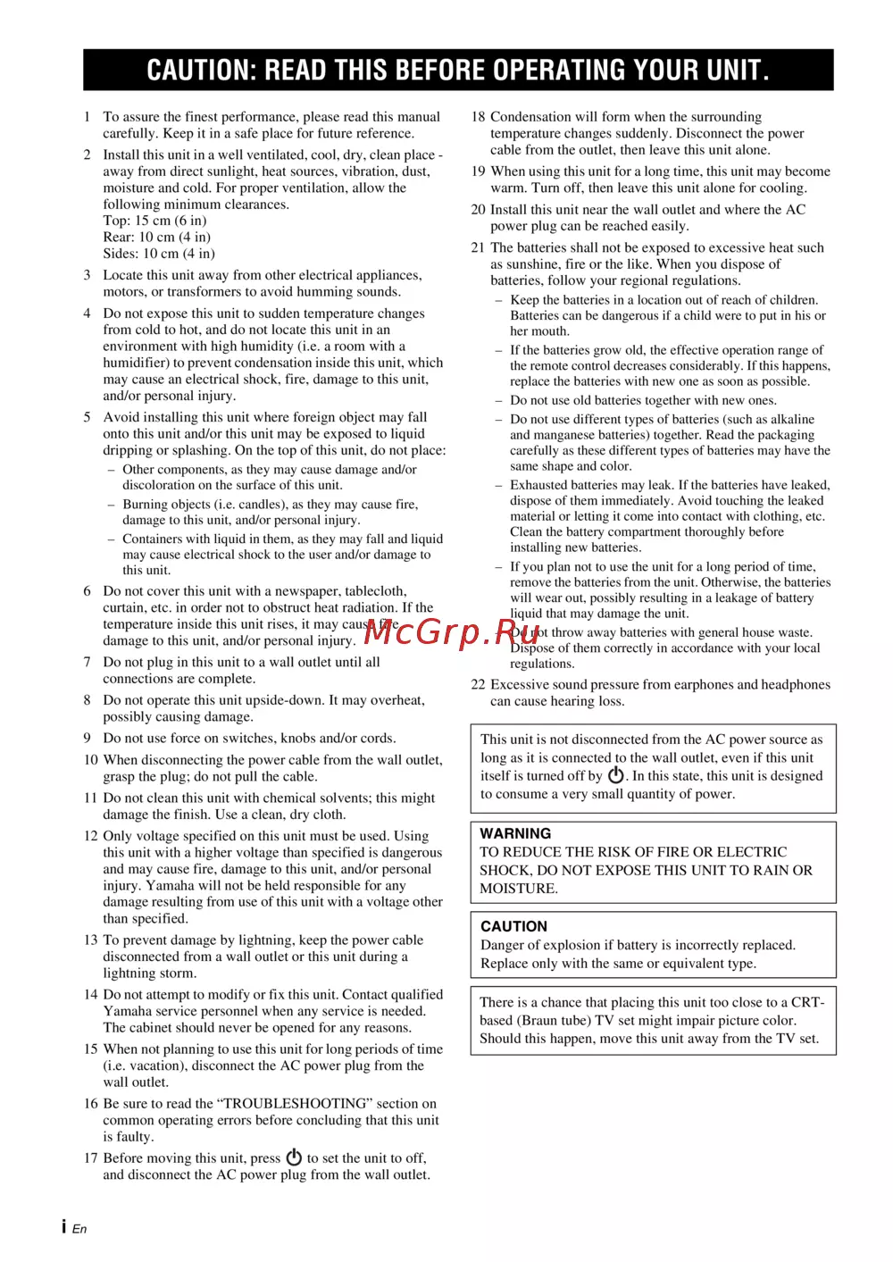 Yamaha MCR-B043 Orange — руководство по безопасной эксплуатации устройства [2/228]