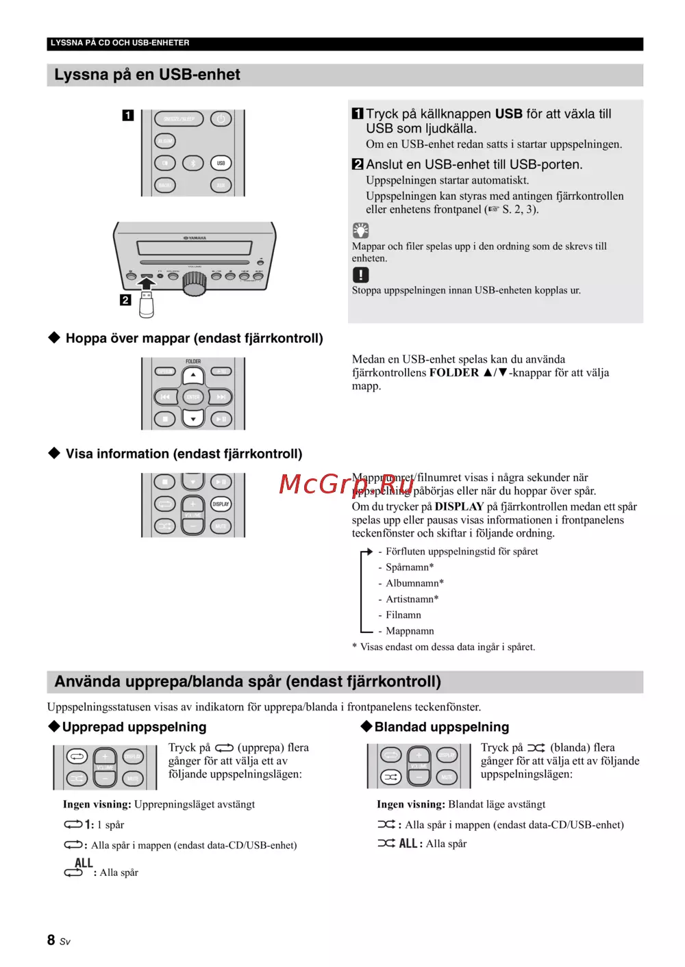 Lär dig hur du enkelt lyssnar på CD och USB-enheter. Få tips om uppspelningslägen, mappval och hur du använder fjärrkontrollen för bästa ljudupplevelse.