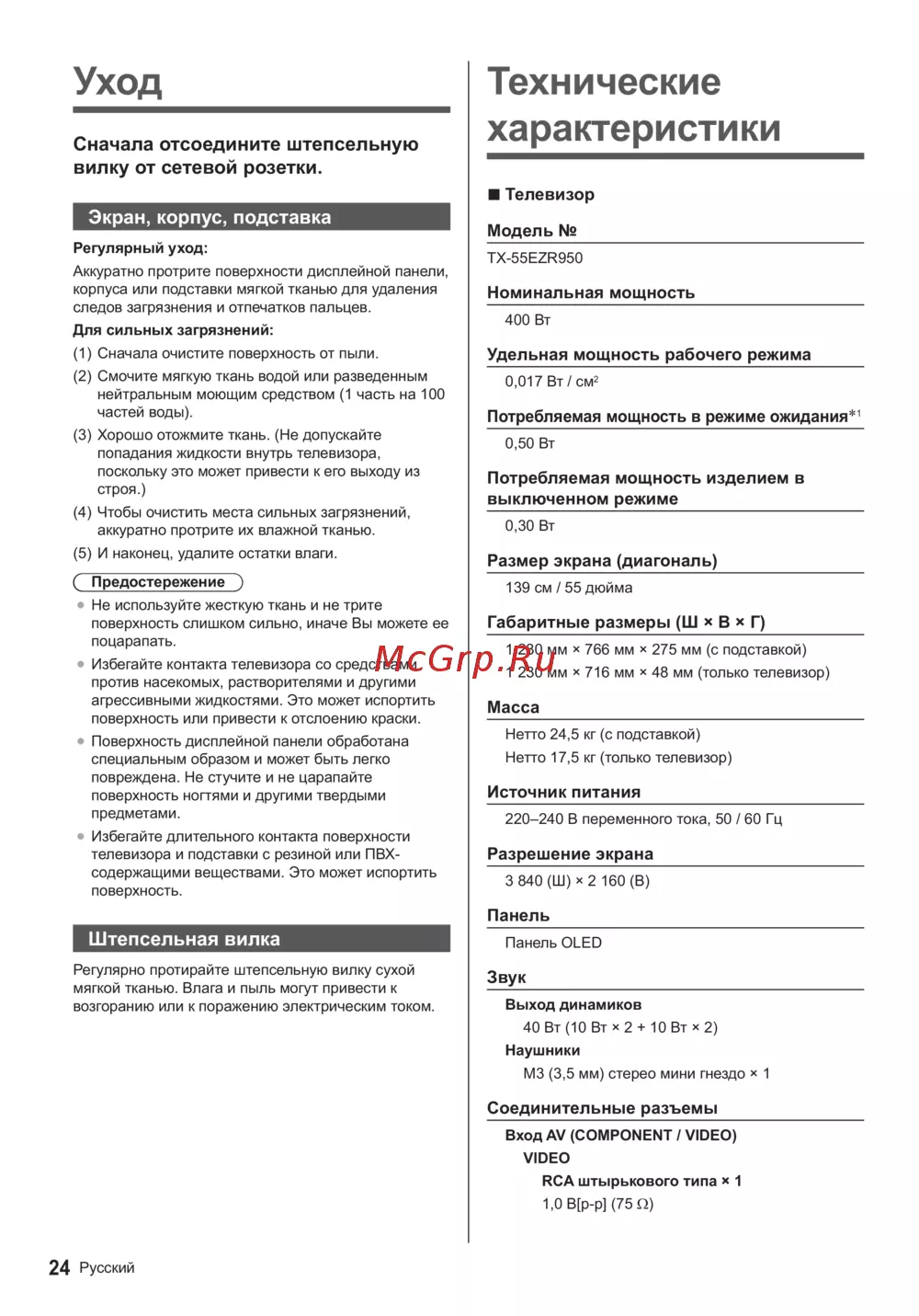 Уход Сначала отсоедините штепсельную вилку от сетевой розетки Технические характеристики Телевизор Экран корпус подставка Модель Регулярный уход Аккуратно протрите поверхности дисплейной панели корпуса или подставки мягкой тканью для удаления TX 55EZR950 Номинальная мощность следов загрязнения и отпечатков пальцев 400 Вт Для сильных загрязнений 1 Сначала очистите поверхность от пыли 2 Смочите мягкую ткань водой или разведенным нейтральным моющим средством 1 часть на 100 частей воды 3 Хорошо отожмите ткань Не допускайте попадания жидкости внутрь телевизора поскольку это может привести к его выходу из строя 4 Чтобы очистить места сильных загрязнений аккуратно протрите их влажной тканью 5 И наконец удалите остатки влаги Предостережение Не используйте жесткую ткань и не трите поверхность слишком сильно иначе Вы можете ее поцарапать Избегайте контакта телевизора со средствами против насекомых растворителями и другими агрессивными жидкостями Это может испортить поверхность или привести к отслоению краски Поверхность дисплейной панели обработана специальным образом и может быть легко повреждена Не стучите и не царапайте поверхность ногтями и другими твердыми предметами Избегайте длительного контакта поверхности телевизора и подставки с резиной или ПВХсодержащими веществами Это может испортить поверхность Удельная мощность рабочего режима 0 017 Вт см2 Потребляемая мощность в режиме ожидания 0 50 Вт Потребляемая мощность изделием в выключенном режиме 0 30 Вт Размер экрана диагональ 139 см 55 дюйма Габаритные размеры Ш х в х г 1 230 мм х 766 мм х 275 мм с подставкой 1 230 мм х 716 мм х 48 мм только телевизор Масса Нетто 24 5 кг с подставкой Нетто 17 5 кг только телевизор Источник питания 220 240 В переменного тока 50 60 Гц Разрешение экрана 3 840 Ш X 2 160 В Панель Штепсельная вилка Регулярно протирайте штепсельную вилку сухой мягкой тканью Влага и пыль могут привести к возгоранию или к поражению электрическим током Панель OLED Звук Выход динамиков 40 Вт 10 Вт х 2 10 Вт х 2 Наушники М3 3 5 мм стерео мини гнездо х 1 Соединительные разъемы Вход AV COMPONENT VIDEO VIDEO RCA штырькового типа х 1 1 0 В р р 75Í2 24 Русский