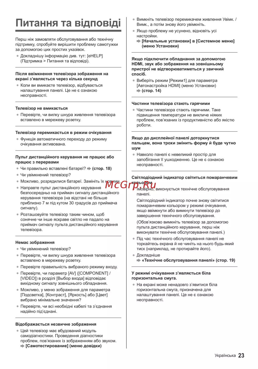 Питання та вщповщ Вимкнгть телев зор перемикачем живлення Ув1мк Вимк а пот м знову його ув мкн ть Якщо проблему не усунено в днов ть ус настройки Перш н ж замовляти обспуговування або техн чну пщтримку опробуйте вир шити проблему самотужки за допомогою цих простих указ вок Ф Начальные установки в Системное меню меню Установки Докладн шу нформац ю див тут eHELP Пщтримка Питання та в дпов д П сля вв мкнення телев зора зображення на екран з являеться через к лька секунд Коли ви вмикаете телев зор вщбуваеться налаштування панель Це не о ознакою Якщо пщключити обладнання за допомогою HDMI звук або зображення на зовн шньому пристро не в дтворюватиметься у звичний спос1б Виберпь режим Режим1 для параметра Автонастройка HDMI меню Установки ф стор 14 несправност Частини телев зора стають гарячими Телев зор не вмикаеться Перев рте чи вилку шнура живлення тепев зора вставлено в мережеву розетку Частини телев зора стають гарячими Таке п двищення температури не викличе н яких проблем пов язаних з продуктивнютю або якютю роботи Телев зор перемикаеться в режим оч кування Функц я автоматичного переходу до режиму очжування активована Пульт дистанщйного керування не працюе або працюе з перервами Якщо до дисплейно 1 панел доторкнутися пальцем вона трохи змшить форму й буде чутно шум Навколо панел е невеликий прост р для запоб гання и ушксдженню Це не е ознакою несправност Чи правильно вставлен батареТ Ф стор 18 Чи ув мкнений тепев зор Можливо розрядилися батареТ ЗамНть Тх новими Направте пульт дистанц йного керування безпосередньо на приймач сигналу дистанц йного керування телев зора на вщстан не б льше приблизно 1 м п д кутом 30 градус в до приймача сигналу Розташовуйте телев зор таким чином щоб сонячне чи нше яскраве св тло не падало на приймач сигналу пульта дистанц йного керування телев зора Св тлод одний ндикатор св титься помаранчевим кольором 1мов рно виконуеться техн чне обспуговування панел Св тлод одний ндикатор почне знову св титися помаранчевим кольором у режим оч кування якщо вв мкнути або вимкнути телев зор до завершения техн чного обспуговування Обов язково вимкн ть телев зор за допомогою пульта дистанц йного керування перш н ж виконувати техн чне обспуговування панел Пщ час техн чного обспуговування панел не Немае зображення Чи ув мкнений телев зор Перев рте чи вилку шнура живлення телев зора вставлено в мережеву розетку торкайтесь екрана й не чин ть на нього будь який тиск наприклад не протирайте його Докладн ше Ф Техжчне обспуговування панел стор 19 Перев рте правильнють вибраного режиму входу Перев рте чи параметр AV COMPONENT У режим оч кування з являеться б ла VIDEO в розд1л1 Выбор входа в дпов1дае горизонтальна смуга вихщному сигналу зовн шнього обпаднання Можливо у меню зображення для параметра Подсветка Контраст Яркость або Цвет вибрано м н1мальне значения На екран може ненадовго з явитися б ла горизонтальна смуга призначена для налаштування панел Це не е ознакою несправност Перев рте чи вс необхщн кабел та з еднання над йно п1д еднан1 В1дображаеться незвичне зображення Цей телев зор мае вбудований модуль самод агностики Проведения д агностики проблем пов язаних з зображенням або звуком Ф Самотестирование меню дов дки УкраТнська 23
