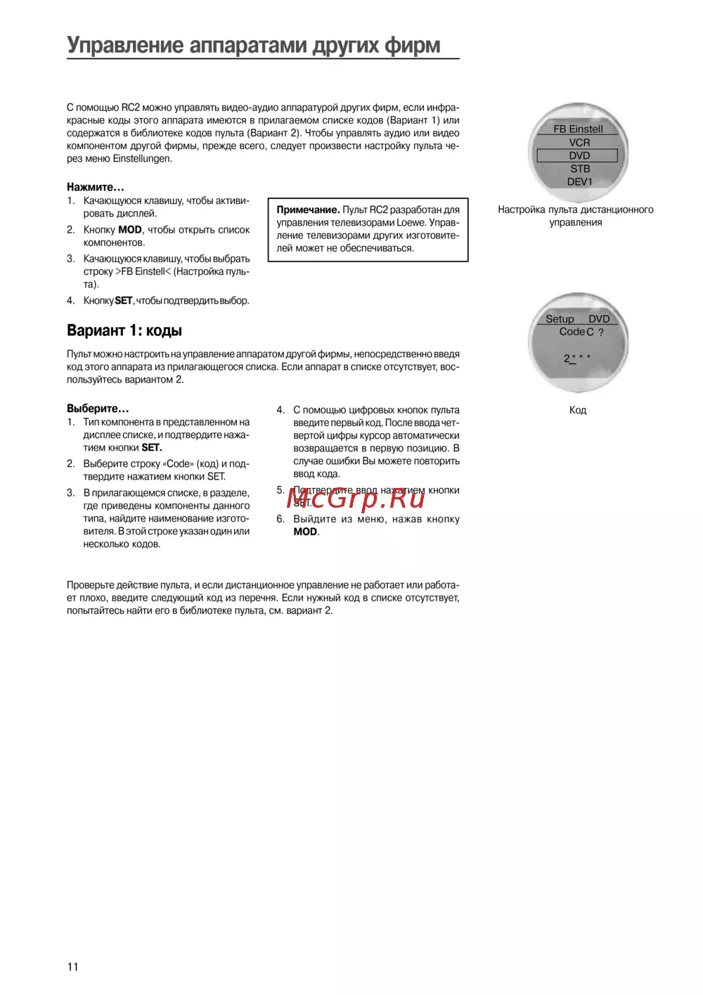 содержатся в библиотеке кодов пульта (Вариант 2). Чтобы управлять аудио или видео