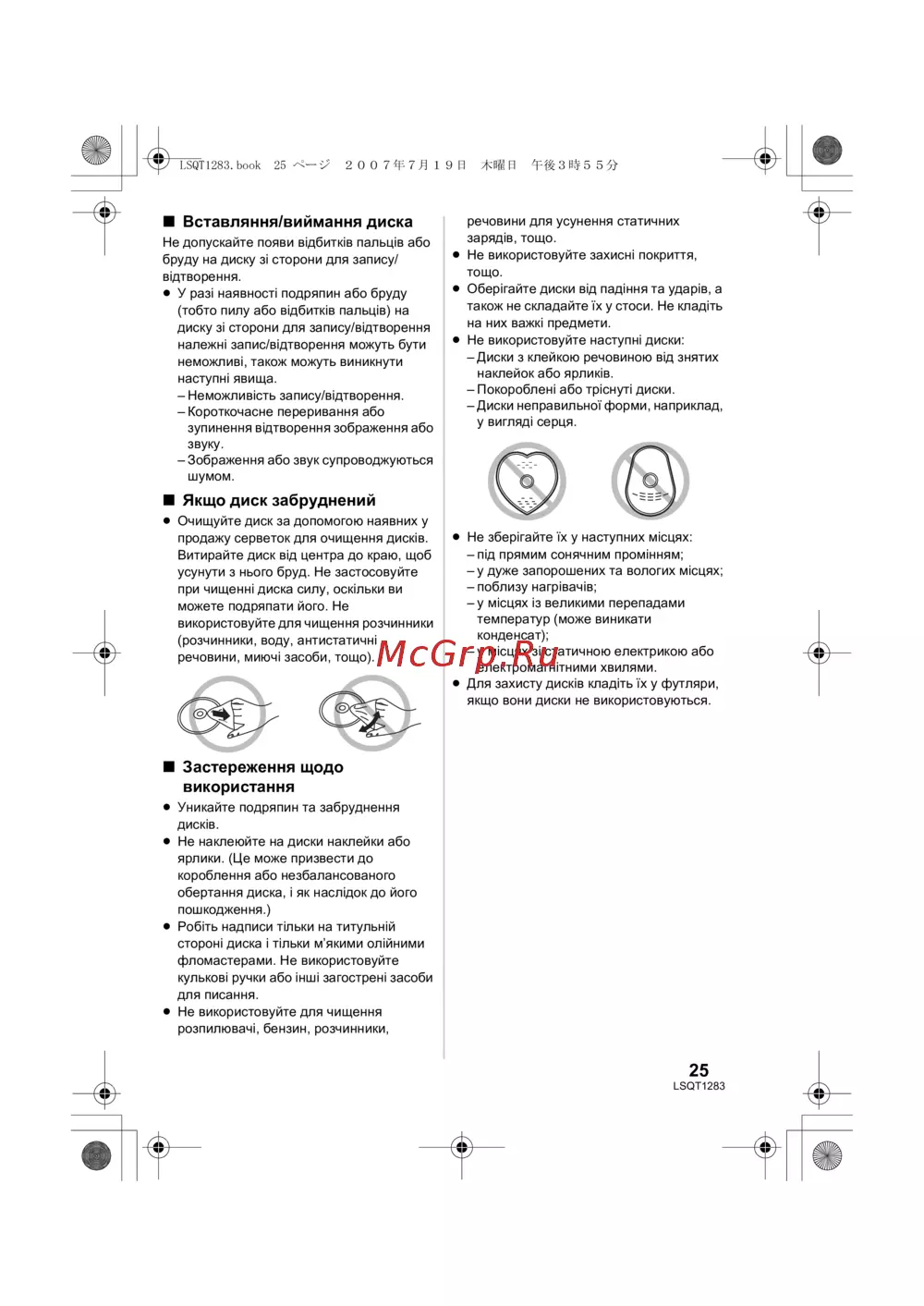 Panasonic VW-BN1 — правила догляду за дисками: очищення та зберігання [25/82]
