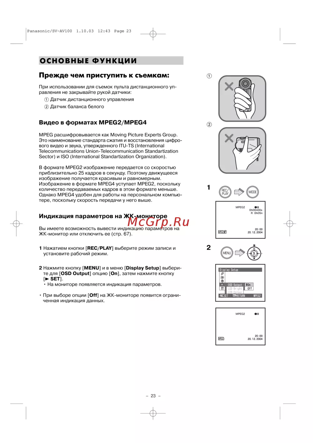 Узнайте о ключевых функциях съемки, форматах видео MPEG2 и MPEG4, а также настройках индикации на ЖК-мониторе. Подготовьтесь к качественной записи.
