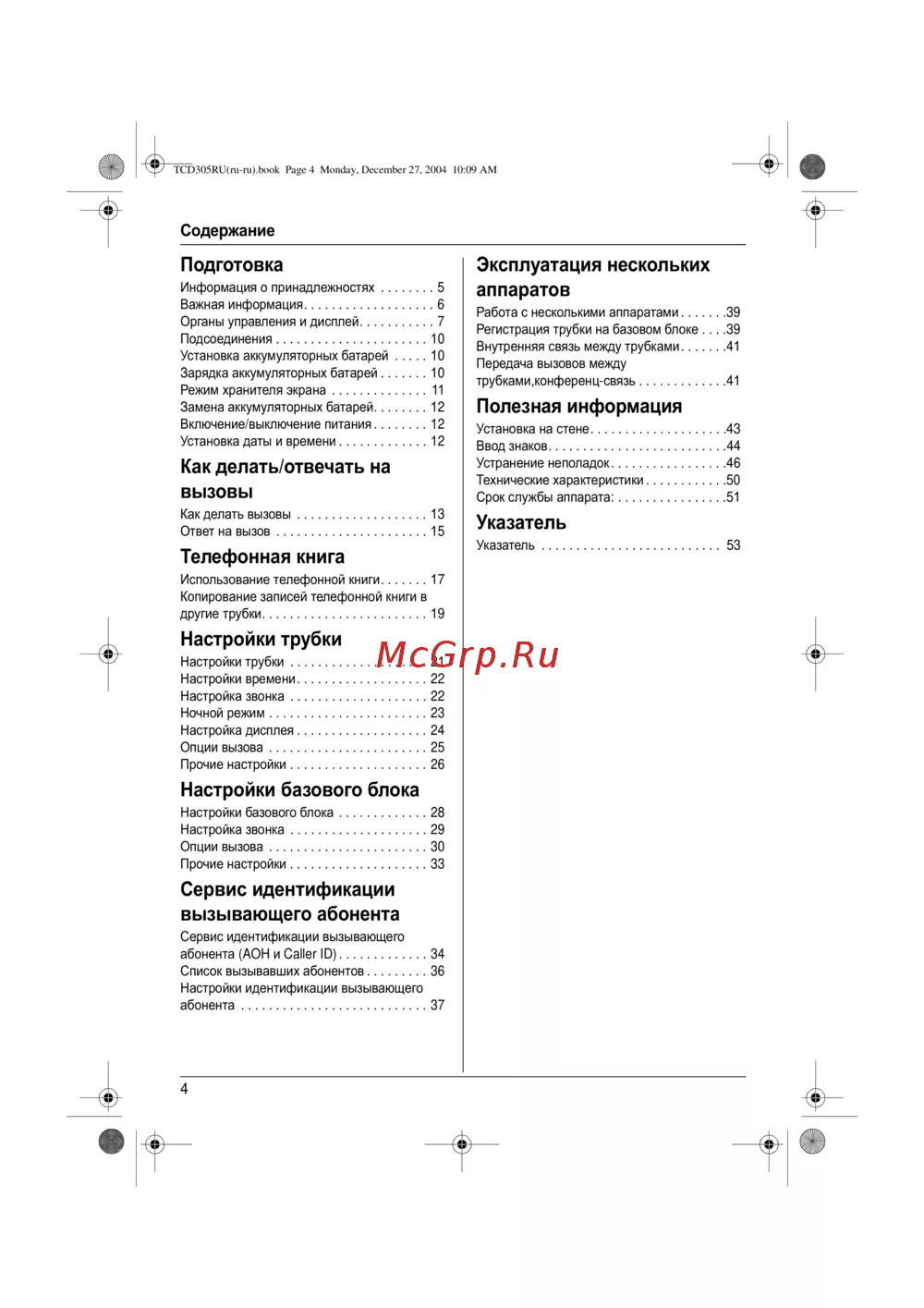 1 Зр TCD3O5RU ru ru b x k Page4 Monday December27 2004 10 09 AM Содержание Подготовка Информация о принадлежностях 5 Важная информация 6 Органы управления и дисплей 7 Подсоединения 10 Установка аккумуляторных батарей 10 Зарядка аккумуляторных батарей 10 Режим хранителя экрана 11 Замена аккумуляторных батарей 12 Включение выключение питания 12 Установка даты и времени 12 Эксплуатация нескольких аппаратов Работа с несколькими аппаратами 39 Регистрация трубки на базовом блоке 39 Внутренняя связь между трубками 41 Передача вызовов между трубками конференц связь 41 Полезная информация Как делать отвечать на вызовы Установка на стене 43 Ввод знаков 44 Устранение неполадок 46 Технические характеристики 50 Срок службы аппарата 51 Как делать вызовы 13 Ответ на вызов 15 Указатель Телефонная книга Использование телефонной книги 17 Копирование записей телефонной книги в другие трубки 19 Настройки трубки Настройки трубки 21 Настройки времени 22 Настройка звонка 22 Ночной режим 23 Настройка дисплея 24 Опции вызова 25 Прочие настройки 26 Настройки базового блока Настройки базового блока 28 Настройка звонка 29 Опции вызова 30 Прочие настройки 33 Сервис идентификации вызывающего абонента Сервис идентификации вызывающего абонента АОН и Caller ID 34 Список вызывавших абонентов 36 Настройки идентификации вызывающего абонента 37 Указатель 53