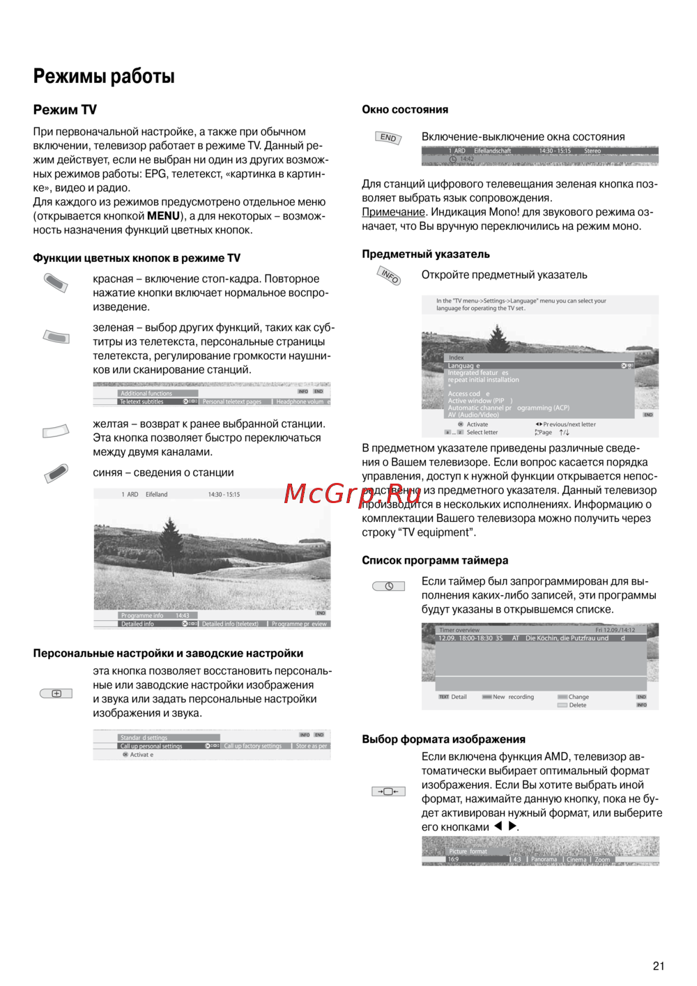 Узнайте о режимах работы телевизора, включая TV, EPG и телетекст. Откройте для себя функции цветных кнопок и настройки изображения и звука.