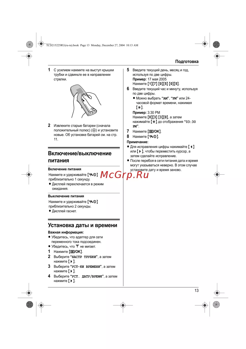 Panasonic KX-TCD225 RU-F — инструкция по замене батарей и установке времени устройства [13/64]