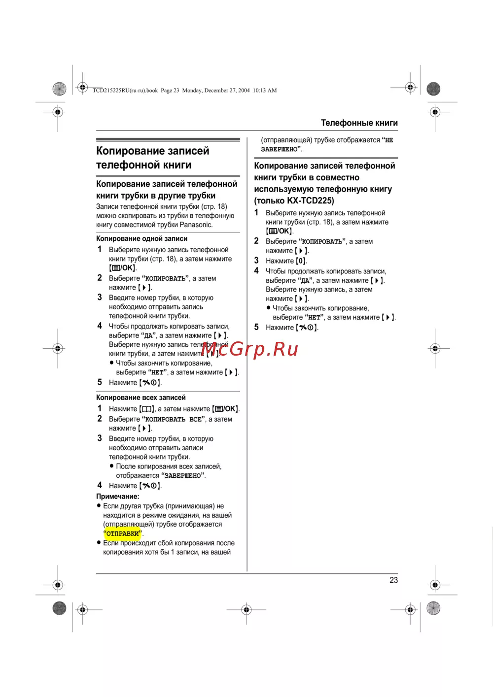 Panasonic KX-TCD225 RU-F — как копировать записи телефонной книги между трубками [23/64]