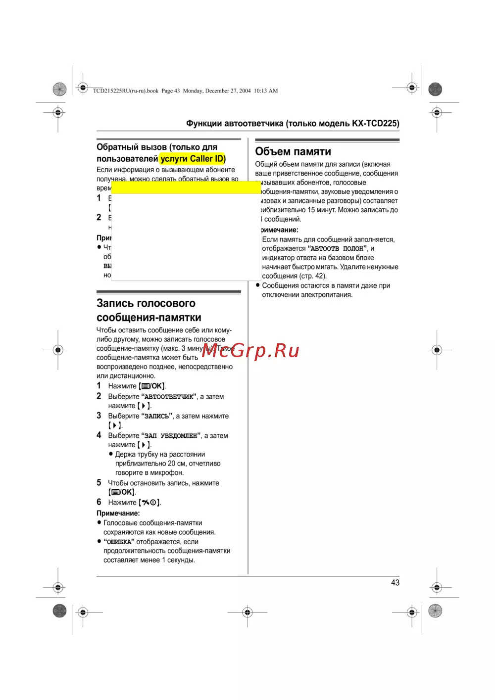 Panasonic KX-TCD225 RU-F — функции автоответчика: запись и обратный вызов сообщений [43/64]