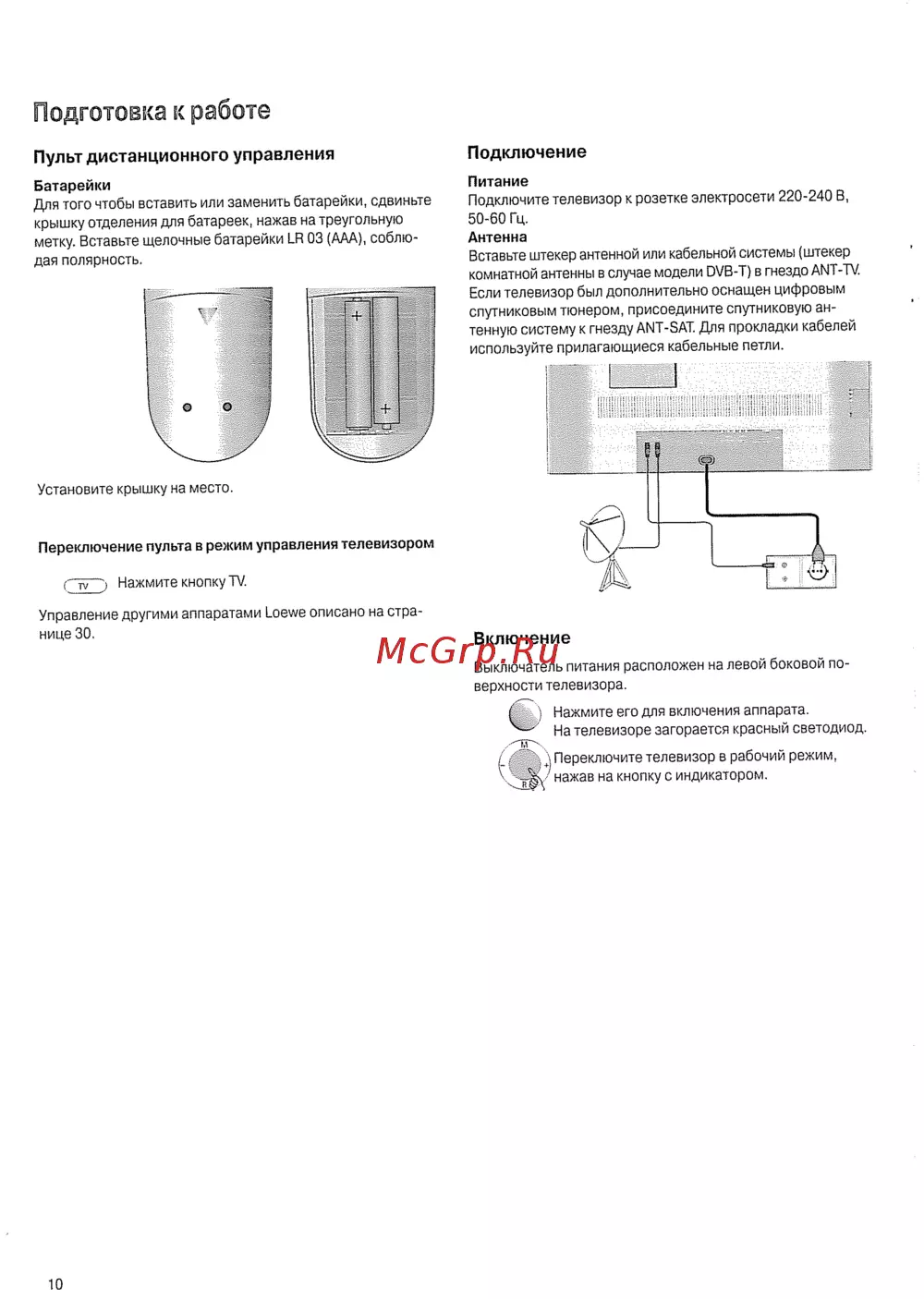 Подготовка к работе Пульт дистанционного управления Подключение Батарейки Для того чтобы вставить или заменить батарейки сдвиньте крышку отделения для батареек нажав на треугольную метку Вставьте щелочные батарейки ЬР 03 ААА соблюдая полярность Питание Подключите телевизор к розетке электросети 220 240 В 50 60 Гц Антенна Вставьте штекер антенной или кабельной системы штекер комнатной антенны в случае модели DVB T в гнездо ANT TV Если телевизор был дополнительно оснащен цифровым спутниковым тюнером присоедините спутниковую ан тенную систему к гнезду ANT SAT Для прокладки кабелей используйте прилагающиеся кабельные петли Установите крышку на место Переключение пульта в режим управления телевизором QFTj Нажмите кнопку TV Управление другими аппаратами Loewe описано на стра нице 30 Включение Выключатель питания расположен на левой боковой по верхности телевизора Нажмите его для включения аппарата На телевизоре загорается красный светодиод Переключите телевизор в рабочий режим нажав на кнопку с индикатором 10