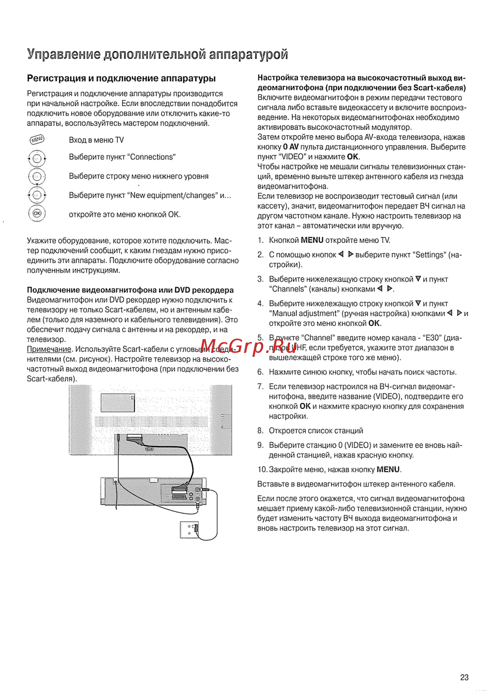 Управление дополнительной аппаратурой Регистрация и подключение аппаратуры Регистрация и подключение аппаратуры производится при начальной настройке Если впоследствии понадобится подключить новое оборудование или отключить какие то аппараты воспользуйтесь мастером подключений Входа меню TV Выберите пункт Connections Выберите строку меню нижнего уровня Выберите пункт New equipment changes и откройте это меню кнопкой ОК Укажите оборудование которое хотите подключить Мас тер подключений сообщит к каким гнездам нужно присо единить эти аппараты Подключите оборудование согласно полученным инструкциям Подключение видеомагнитофона или DVD рекордера Видеомагнитофон или DVD рекордер нужно подключить к телевизору не только Scart кабелем но и антенным кабе лем только для наземного и кабельного телевидения Это обеспечит подачу сигнала с антенны и на рекордер и на телевизор Примечание Используйте Scart кабели с угловыми соеди нителями см рисунок Настройте телевизор на высоко частотный выход видеомагнитофона при подключении без Scart кабеля Настройка телевизора на высокочастотный выход ви деомагнитофона при подключении без Scart кабеля Включите видеомагнитофон в режим передачи тестового сигнала либо вставьте видеокассету и включите воспроиз ведение На некоторых видеомагнитофонах необходимо активировать высокочастотный модулятор Затем откройте меню выбора AV входа телевизора нажав кнопку О AV пульта дистанционного управления Выберите пункт VIDEO и нажмите ОК Чтобы настройке не мешали сигналы телевизионных стан ций временно выньте штекер антенного кабеля из гнезда видеомагнитофона Если телевизор не воспроизводит тестовый сигнал или кассету значит видеомагнитофон передает ВЧ сигнал на другом частотном канале Нужно настроить телевизор на этот канал автоматически или вручную 1 Кнопкой MENU откройте меню TV 2 С помощью кнопок выберите пункт Settings на стройки 3 Выберите нижележащую строку кнопкой V и пункт Channels каналы кнопками 1 4 Выберите нижележащую строку кнопкой V и пункт Manual adjustment ручная настройка кнопками 1 и откройте это меню кнопкой ОК 5 В пункте Channel введите номер канала ЕЗО диа пазон UHF если требуется укажите этот диапазон в вышележащей строке того же меню 6 Нажмите синюю кнопку чтобы начать поиск частоты 7 Если телевизор настроился на ВЧ сигнал видеомаг нитофона введите название VIDEO подтвердите его кнопкой ОК и нажмите красную кнопку для сохранения настройки 8 Откроется список станций 9 Выберите станцию О VIDEO и замените ее вновь най денной станцией нажав красную кнопку 10 Закройте меню нажав кнопку MENU Вставьте в видеомагнитофон штекер антенного кабеля Если после этого окажется что сигнал видеомагнитофона мешает приему какой либо телевизионной станции нужно будет изменить частоту ВЧ выхода видеомагнитофона и вновь настроить телевизор на этот сигнал 23