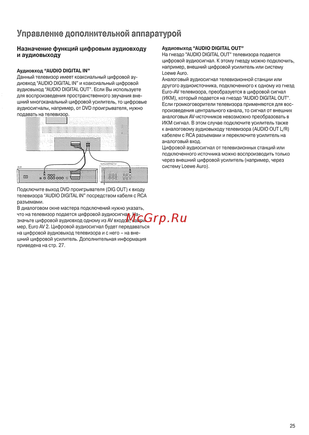 Управление дополнительной аппаратурой Назначение функций цифровым аудиовходу и аудиовыходу Аудиовход AUDIO DIGITAL IN Данный телевизор имеет коаксиальный цифровой ау диовход AUDIO DIGITAL IN и коаксиальный цифровой аудиовыход AUDIO DIGITAL OUT Если Вы используете для воспроизведения пространственного звучания вне шний многоканальный цифровой усилитель то цифровые аудиосигналы например от DVD проигрывателя нужно подавать на телевизор Аудиовыход AUDIO DIGITAL OUT На гнездо AUDIO DIGITAL OUT телевизора подается цифровой аудиосигнал К этому гнезду можно подключить например внешний цифровой усилитель или систему Loewe Auro Аналоговый аудиосигнал телевизионной станции или другого аудиоисточника подключенного к одному из гнезд Euro AV телевизора преобразуется в цифровой сигнал ИКМ который подается на гнездо AUDIO DIGITAL OUT Если громкоговорители телевизора применяются для вос произведения центрального канала то сигнал от внешних аналоговых AV источников невозможно преобразовать в ИКМ сигнал В этом случае подключите усилитель также к аналоговому аудиовыходу телевизора AUDIO OUT L R кабелем с RCA разъемами и переключите усилитель на аналоговый вход Цифровой аудиосигнал от телевизионных станций или подключенного источника можно воспроизводить только через внешний цифровой усилитель например через систему Loewe Auro Подключите выход DVD проигрывателя DIG OUT к входу телевизора AUDIO DIGITAL IN посредством кабеля с RCA разъемами В диалоговом окне мастера подключений нужно указать что на телевизор подается цифровой аудиосигнал На значьте цифровой аудиовход одному из AV входов напри мер Euro AV 2 Цифровой аудиосигнал будет передаваться на цифровой аудиовыход телевизора и с него на вне шний цифровой усилитель Дополнительная информация приведена на стр 27 25