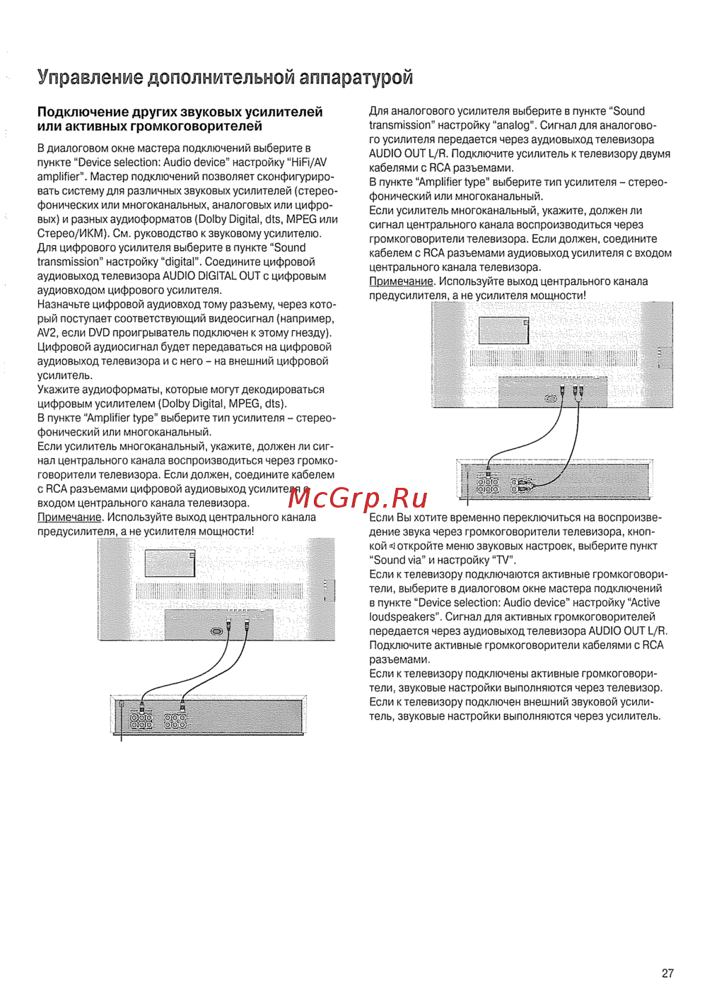 Управление дополнительной аппаратурой Подключение других звуковых усилителей или активных громкоговорителей В диалоговом окне мастера подключений выберите в пункте Device selection Audio device настройку HiFi AV amplifier 1 Мастер подключений позволяет сконфигуриро вать систему для различных звуковых усилителей стерео фонических или многоканальных аналоговых или цифро вых и разных аудиоформатов Dolby Digital dts MPEG или Стерео ИКМ См руководство к звуковому усилителю Для цифрового усилителя выберите в пункте Sound transmission настройку digital Соедините цифровой аудиовыход телевизора AUDIO DIGITAL OUT с цифровым аудиовходом цифрового усилителя Назначьте цифровой аудиовход тому разъему через кото рый поступает соответствующий видеосигнал например AV2 если DVD проигрыватель подключен к этому гнезду Цифровой аудиосигнал будет передаваться на цифровой аудиовыход телевизора и с него на внешний цифровой усилитель Укажите аудиоформаты которые могут декодироваться цифровым усилителем Dolby Digital MPEG dts В пункте Amplifier type выберите тип усилителя стерео фонический или многоканальный Если усилитель многоканальный укажите должен ли сиг нал центрального канала воспроизводиться через громко говорители телевизора Если должен соедините кабелем с RCA разъемами цифровой аудиовыход усилителя с входом центрального канала телевизора Примечание Используйте выход центрального канала предусилит а не усилителя мощности Для аналогового усилителя выберите в пункте Sound transmission настройку analog Сигнал для аналогово го усилителя передается через аудиовыход телевизора AUDIO OUT L R Подключите усилитель к телевизору двумя кабелями с RCA разъемами В пункте Amplifier type выберите тип усилителя стерео фонический или многоканальный Если усилитель многоканальный укажите должен ли сигнал центрального канала воспроизводиться через громкоговорители телевизора Если должен соедините кабелем с RCA разъемами аудиовыход усилителя с входом центрального канала телевизора Примечание Используйте выход центрального канала предусилителя а не усилителя мощности Если Вы хотите временно переключиться на воспроизве дение звука через громкоговорители телевизора кноп кой 1 откройте меню звуковых настроек выберите пункт Sound via и настройку TV Если к телевизору подключаются активные громкоговори тели выберите в диалоговом окне мастера подключений в пункте Device selection Audio device настройку Active loudspeakers Сигнал для активных громкоговорителей передается через аудиовыход телевизора AUDIO OUT L R Подключите активные громкоговорители кабелями с RCA разъемами Если к телевизору подключены активные громкоговори тели звуковые настройки выполняются через телевизор Если к телевизору подключен внешний звуковой усили тель звуковые настройки выполняются через усилитель 27