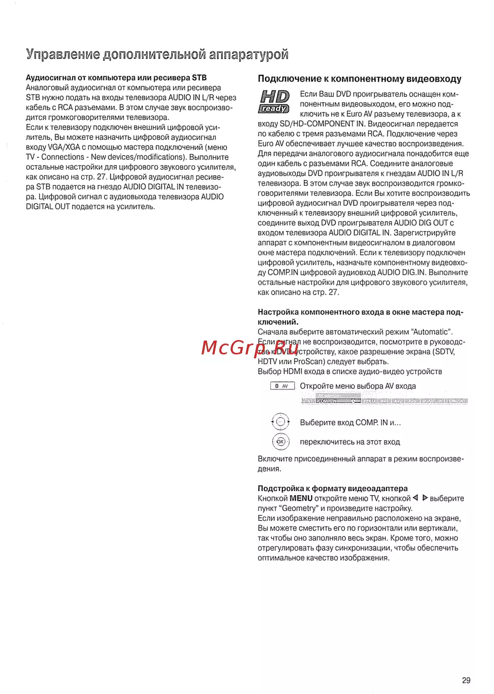 Управление дополнительной аппаратурой Аудиосигнал от компьютера или ресивера STB Аналоговый аудиосигнал от компьютера или ресивера STB нужно подать на входы телевизора AUDIO IN L R через кабель с RCA разъемами В этом случае звук воспроизво дится громкоговорителями телевизора Если к телевизору подключен внешний цифровой уси литель Вь можете назначить цифровой аудиосигнал входу VGA XGA с помощью мастера подключений меню TV Connections New devices modifications Выполните остальные настройки для цифрового звукового усилителя как описано на стр 27 Цифровой аудиосигнал ресиве ра STB подается на гнездо AUDIO DIGITAL IN телевизо ра Цифровой сигнал с аудиовыхода телевизора AUDIO DIGITAL OUT подается на усилитель Подключение к компонентному видеовходу HD Если Ваш DVD проигрыватель оснащен ком понентным видеовыходом его можно под ключить не к Euro AV разъему телевизора а к входу SD HD COMPONENTIN Видеосигнал передается по кабелю с тремя разъемами RCA Подключение через Euro AV обеспечивает лучшее качество воспроизведения Для передачи аналогового аудиосигнала понадобится еще один кабель с разъемами RCA Соедините аналоговые аудиовыходы DVD проигрывателя к гнездам AUDIO IN L R телевизора В этом случае звук воспроизводится громко говорителями телевизора Если Вы хотите воспроизводить цифровой аудиосигнал DVD проигрывателя через под ключенный к телевизору внешний цифровой усилитель соедините выход DVD проигрывателя AUDIO DIG OUT с входом телевизора AUDIO DIGITAL IN Зарегистрируйте аппарат с компонентным видеосигналом в диалоговом окне мастера подключений Если к телевизору подключен цифровой усилитель назначьте компонентному видеовхо ду COMP IN цифровой аудиовход AUDIO DIG IN Выполните остальные настройки для цифрового звукового усилителя как описано на стр 27 Настройка компонентного входа в окне мастера под ключений Сначала выберите автоматический режим Automatic Если сигнал не воспроизводится посмотрите в руководс тве к DVD устройству какое разрешение экрана SDTV HDTV или ProScan следует выбрать Выбор HDMI входа в списке аудио видео устройств I о АУ 1 Откройте меню выбора AV входа Выберите входСОМР IN и переключитесь на этот вход Включите присоединенный аппарат в режим воспроизве дения Подстройка к формату видеоадаптера Кнопкой MENU откройте меню TV кнопкой выберите пункт Geometry и произведите настройку Если изображение неправильно расположено на экране Вы можете сместить его по горизонтали или вертикали так чтобы оно заполняло весь экран Кроме того можно отрегулировать фазу синхронизации чтобы обеспечить оптимальное качество изображения 29