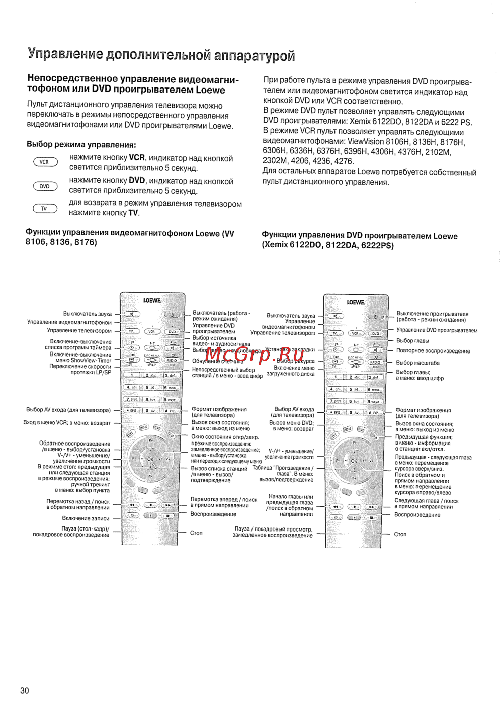 - При работе пульта в режиме управления dvd проигрыва телем или видеомагнитофоном светится индикатор над кнопкой dvd или vcr соответственно в режиме dvd пульт позволяет управлять следующими dvd проигрывателями xemix6122do 8122da и 6222 ps в режиме vcr пульт позволяет управлять следующими видеомагнитофонами viewvision 8106н 8136н 8176н 6306н 6336н 6376н 6396н 4306н 4376н 2102м 2302м 206 4236 4276 для остальных аппаратов loewe потребуется собственный пульт дистанционного управления p.30