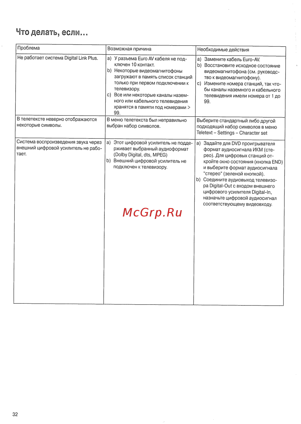 Что делать если Проблема Возможная причина Необходимые действия Не работает система Digital Link Plus а У разъема Euro AV кабеля не под ключен 10 контакт Ь Некоторые видеомагнитофоны загружают в память список станций только при первом подключении к телевизору с Все или некоторые каналы назем ного или кабельного телевидения хранятся в памяти под номерами 99 а Замените кабель Euro AV b Восстановите исходное состояние видеомагнитофона см руководс тво к видеомагнитофону с Измените номера станций так что бы каналы наземного и кабельного телевидения имели номера от 1 до 99 В телетексте неверно отображаются некоторые символы В меню телетекста был неправильно выбран набор символов Выберите стандартный либо другой подходящий набор символов в меню Teletext Settings Character set Система воспроизведения звука через внешний цифровой усилитель не рабо тает а Этот цифровой усилитель не подде рживает выбранный аудиоформат Dolby Digital dts MPEG b Внешний цифровой усилитель не подключен к телевизору а Задайте для DVD проигрывателя формат аудиосигнала ИКМ сте рео Для цифровых станций от кройте окно состояния кнопка END и выберите формат аудиосигнала стерео зеленой кнопкой Ь Соедините аудиовыход телевизо ра Digital Out с входом внешнего цифрового усилителя Digital In назначьте цифровой аудиосигнал соответствующему видеовходу 32