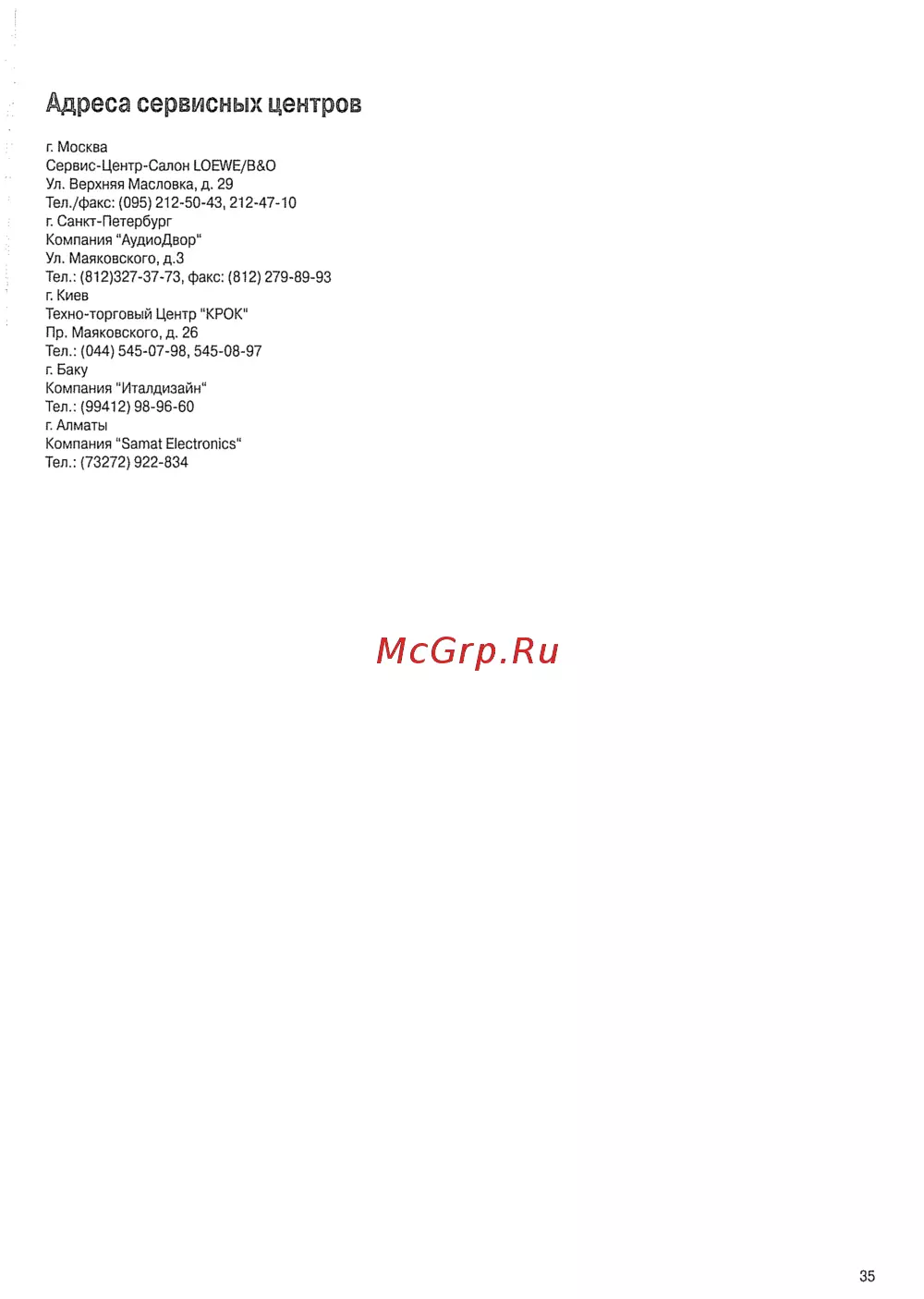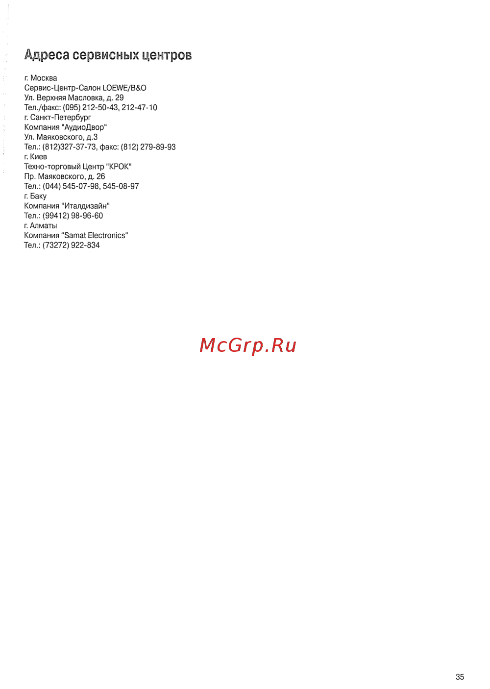 Адреса сервисных центров г Москва Сервис Центр Салон LOEWE B O Ул Верхняя Масловка д 29 Тел факс 095 212 50 43 212 47 10 г Санкт Петербург Компания АудиоДвор Ул Маяковского д З Тел 812 327 37 73 факс 812 279 89 93 г Киев Техно торговый Центр КРОК Пр Маяковского д 26 Тел 044 545 07 98 545 08 97 г Баку Компания Италдизайн Тел 99412 98 96 60 г Алматы Компания Samat Electronics Тел 73272 922 834 35
