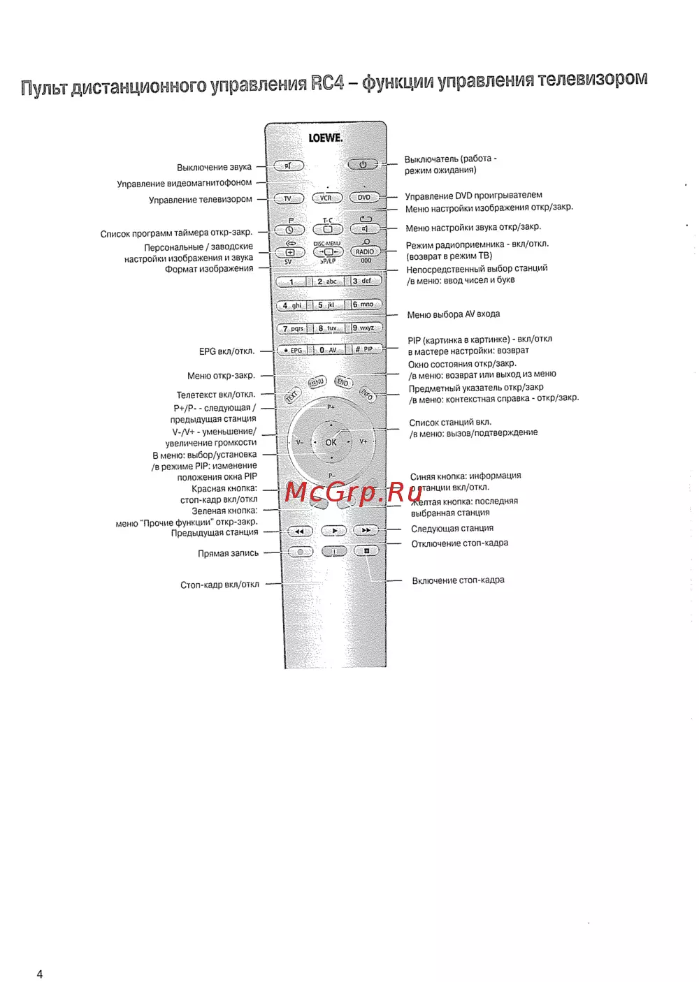 Пульт дистанционного управления RC4 функции управления телевизором LOEWE Выключатель работа режим ожидания Выключение звука Управление видеомагнитофоном Управление телевизором УСТ DVD TV Управление DVD проигрывателем Меню настройки изображения откр закр spy Список программ таймера откр закр Персональные заводские настройки изображения и звука Формат изображения Меню настройки звука откр закр DiS О RADIO эР LP ООО Режим радиоприемника вкл откл возврат в режим ТВ Непосредственный выбор станций I 2 abc 3 def 1 в меню ввод чисел и букв 4 ghi I I 5 H I 6 mno Меню выбора AV входа 7 РЧ I I 8 tuv I 9 wxyz EPG вкл откл Меню откр закр Телетекст вкл откл SPG j О АУ PIP PIP картинка в картинке вкл откл в мастере настройки возврат Окно состояния откр закр в меню возврат или выход из меню Предметный указатель откр закр в меню контекстная справка откр закр Р Р следующая предыдущая станция V V уменьшение Список станций вкл в меню вызов подтверждение увеличение громкости В меню выбор установка в режиме PIP изменение положения окна PIP Красная кнопка стоп кадр вкл откл Зеленая кнопка меню Прочие функции откр закр Предыдущая станция Синяя кнопка информация о станции вкл откл Желтая кнопка последняя выбранная станция Следующая станция Отключение стоп кадра Прямая запись Стоп кадр вкл откл 4 Включение стоп кадра