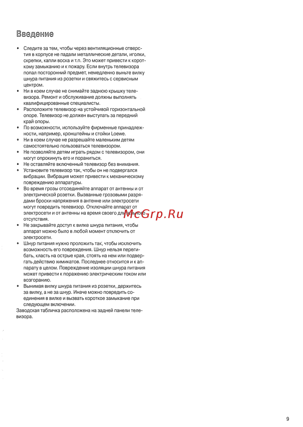 Введение Следите за тем чтобы через вентиляционные отверс тия в корпусе не падали металлические детали иголки скрепки капли воска и т п Это может привести к корот кому замыканию и к пожару Если внутрь телевизора попал посторонний предмет немедленно выньте вилку шнура питания из розетки и свяжитесь с сервисным центром Нив коем случае не снимайте заднюю крышку теле визора Ремонт и обслуживание должны выполнять квалифицированные специалисты Расположите телевизор на устойчивой горизонтальной опоре Телевизор не должен выступать за передний край опоры о По возможности используйте фирменные принадлеж ности например кронштейны и стойки Loewe о Нив коем случае не разрешайте маленьким детям самостоятельно пользоваться телевизором Не позволяйте детям играть рядом с телевизором они могут опрокинуть его и пораниться Не оставляйте включенный телевизор без внимания о Установите телевизор так чтобы он не подвергался вибрации Вибрация может привести к механическому повреждению аппаратуры Во время грозы отсоединяйте аппарат от антенны и от электрической розетки Вызванные грозовыми разря дами броски напряжения в антенне или электросети могут повредить телевизор Отключайте аппарат от электросети и от антенны на время своего длительного отсутствия Не закрывайте доступ к вилке шнура питания чтобы аппарат можно было в любой момент отключить от электросети Шнур питания нужно проложить так чтобы исключить возможность его повреждения Шнур нельзя переги бать класть на острые края стоять на нем или подвер гать действию химикатов Последнее относится и к ап парату в целом Повреждение изоляции шнура литания может привести к поражению электрическим током или возгоранию Вынимая вилку шнура питания из розетки держитесь за вилку а не за шнур Иначе можно повредить со единения в вилке и вызвать короткое замыкание при следующем включении Заводская табличка расположена на задней панели теле визора 9