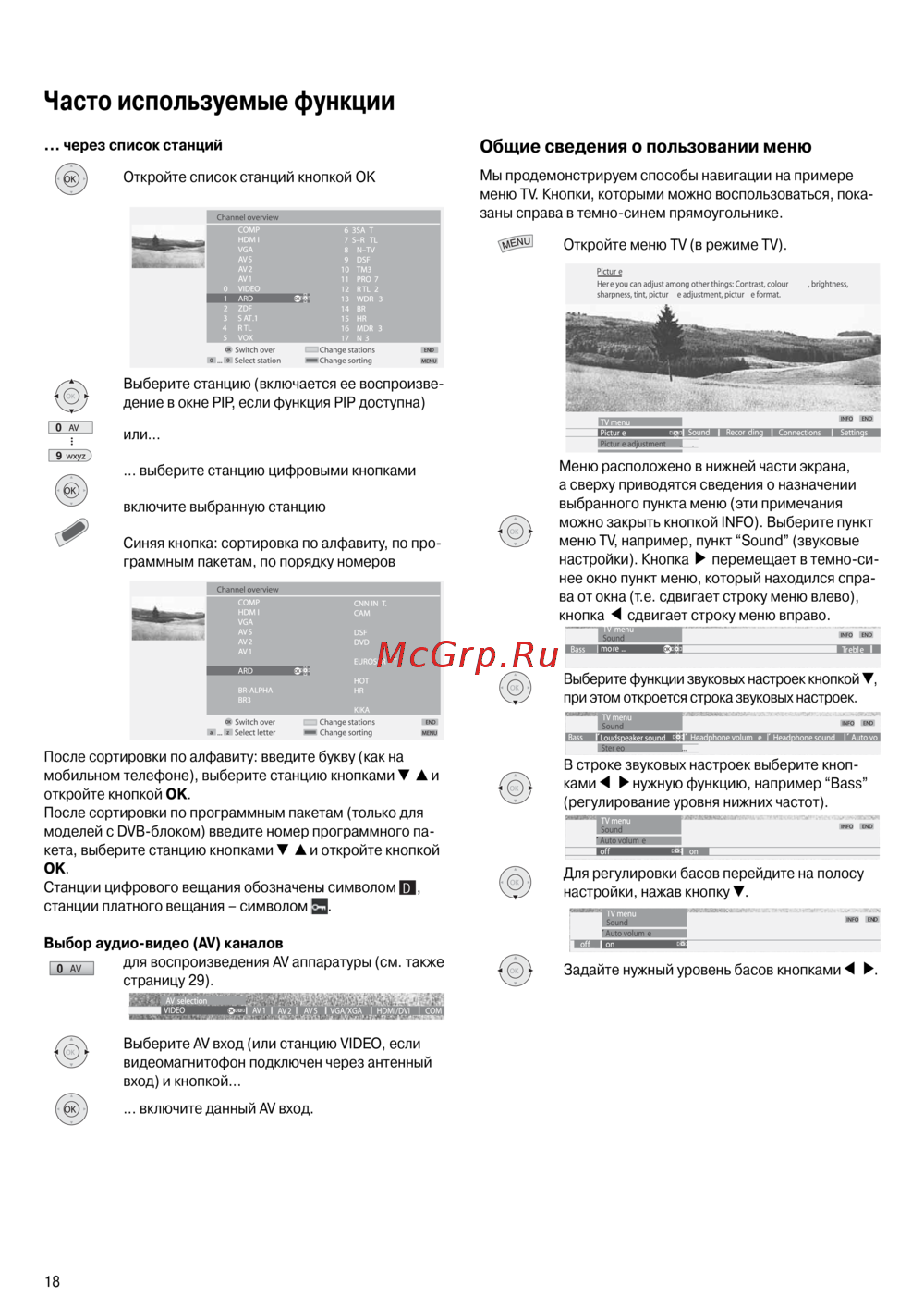 Узнайте о часто используемых функциях и навигации в меню телевизора. Откройте список станций, выберите AV вход и настройте звуковые параметры легко и быстро.