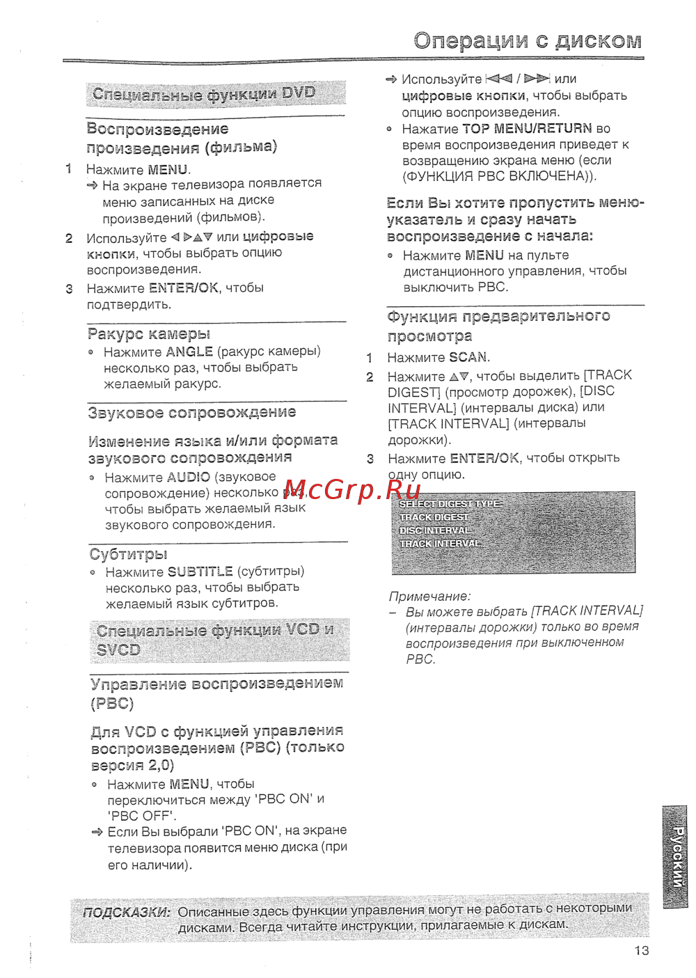 Операции с диском Воспроизведение произведения фильма 1 Нажмите MENU На экране телевизора появляется меню записанных на диске произведений фильмов 2 Используйте ИЛИ цифровые кнопки чтобы выбрать опцию воспроизведения 3 Нажмите ENTER ОК чтобы подтвердить Ракурс камеры э Нажмите ANGLE ракурс камеры несколько раз чтобы выбрать желаемый ракурс Звуковое сопровождение Изменение языка и или формата звукового сопровождения Нажмите АШОЮ звуковое сопровождение несколько раз чтобы выбрать желаемый язык звукового сопровождения Используйте или цифровые кнопки чтобы выбрать опцию воспроизведения э Нажатие TOP MENU RETURN во время воспроизведения приведет к возвращению экрана меню если ФУНКЦИЯ РВС ВКЛЮЧЕНА Если Вы хотите пропустить меню указатель и сразу начать воспроизведение с начала Нажмите MENU на пульте дистанционного управления чтобы выключить РВС Функция предварительного просмотра 1 Нажмите SCAN 2 Нажмите AV чтобы выделить TRACK DIGEST просмотр дорожек DISC INTERVAL интервалы диска или TRACK INTERVAL интервалы дорожки 3 Нажмите ENTER ОК чтобы открыть одну опцию Субтитры е Нажмите SUBTITLE субтитры несколько раз чтобы выбрать желаемый язык субтитров Примечание Вы можете выбрать TRACK INTERVAL интервалы дорожки только во время воспроизведения при выключенном РВС Управление воспроизведением РВС Для VCD с функцией управления воспроизведением РВС только версия 2 0 Нажмите MENU чтобы переключиться между РВС ON и РВС OFF Если Вы выбрали РВС ON на экране телевизора появится меню диска при его наличии ПОДСКАЗКИ Описанные здесь функции управления могут не работать с некоторыми дисками Всегда читайте инструкции прилагаемые к дискам 13