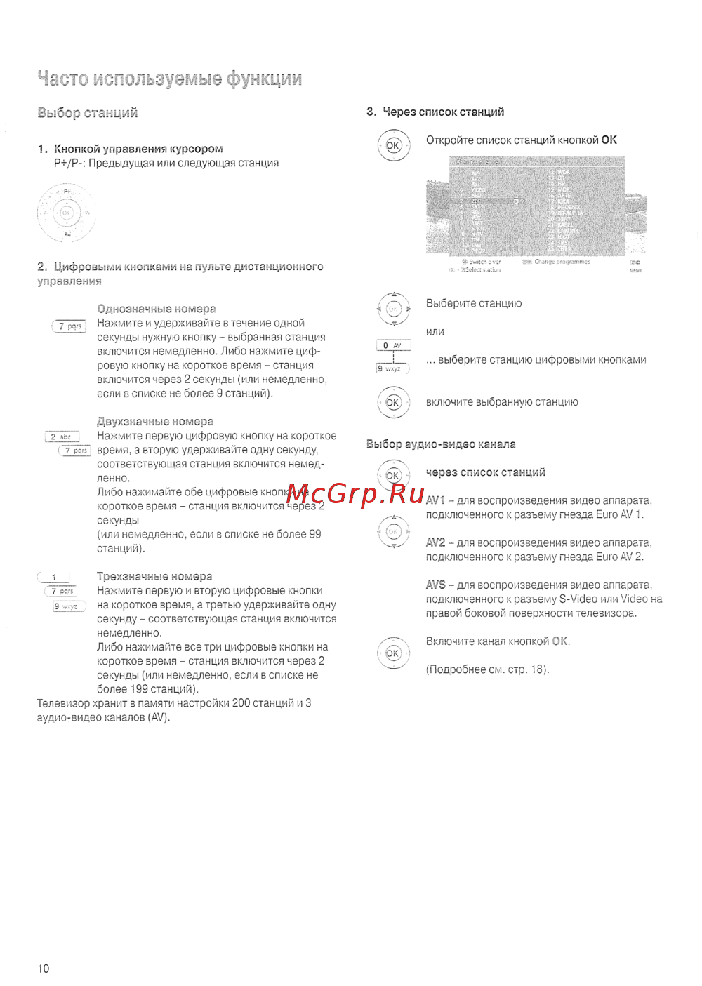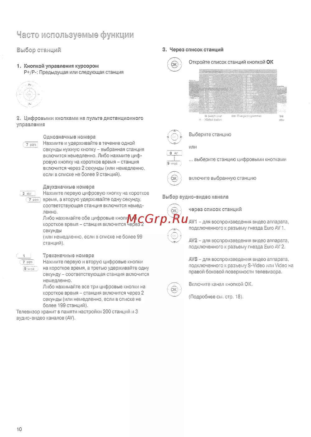 Ц У ЛИ УУУУУ _ Выбор станций 3 Через список станций Откройте список станций кнопкой ОК 1 Кнопкой управления курсором Ръ Р Предыдущая или следующая станция 2 Цифровыми кнопками на пульте дистанционного управления Однозначные номера гуфрл Нажмите и удерживайте в течение одной секунды нужную кнопку выбранная станция включится немедленно Либо нажмите циф ровую кнопку на короткое время станция включится через 2 секунды или немедленно если в списке не более 9 станций Двухзначные номера ГгОьП Нажмите первую цифровую кнопку на короткое рдга время а вторую удерживайте одну секунду соответствующая станция включится немед ленно Либо нажимайте обе цифровые кнопки на короткое время станция включится через 2 секунды или немедленно если в списке не более 99 станций Ц 1 Трехзначные номера ТЛИ Нажмите первую и вторую цифровые кнопки 2 на короткое время а третью удерживайте одну секунду соответствующая станция включится немедленно Либо нажимайте все три цифровые кнопки на короткое время станция включится через 2 секунды или немедленно если в списке не более 199 станций Телевизор хранит в памяти настройки 200 станций и 3 аудио видео каналов АУ 10 Выберите станцию или ПГАО __ i_ выберите станцию цифровыми кнопками 9 wxyz эк включите выбранную станцию Выбор аудио видео канала О ч через список станций AV1 для воспроизведения видео аппарата подключенного к разъему гнезда Euro AV 1 AV2 для воспроизведения видео аппарата подключенного к разъему гнезда Euro Ш 2 AVS для воспроизведения видео аппарата подключенного к разъему S Video или Video на правой боковой поверхности телевизора Включите канал кнопкой ОК Ьк Подробнее см стр 18
