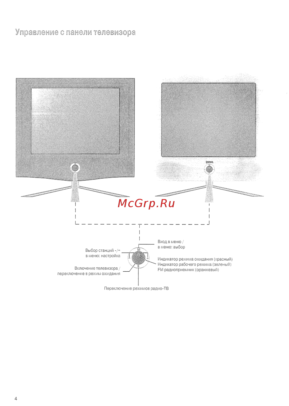 I________ I Выбор станций в меню настройка Включение телевизора переключение в режим ожидания Вход в меню в меню выоор Индикатор режима ожидания красный Индикатор рабочего режима зеленый РМ радиоприемник оранжевый Переключение режимов радио 1В 4
