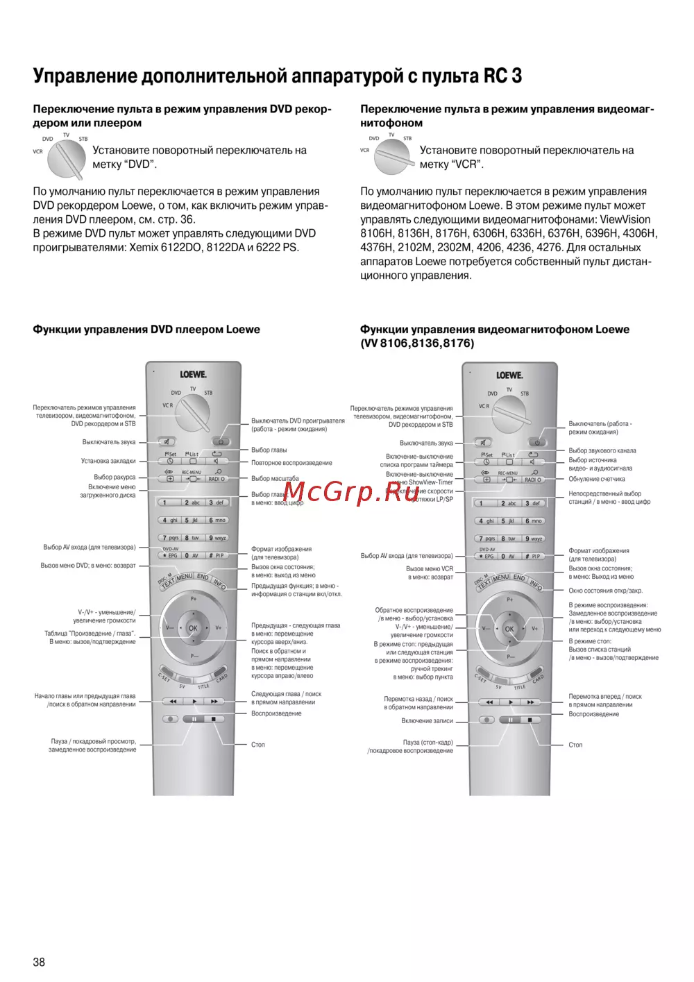 - Функции управления dvd плеером loewe функции управления видеомагнитофоном loewe vv 8106 8136 8176 p.38