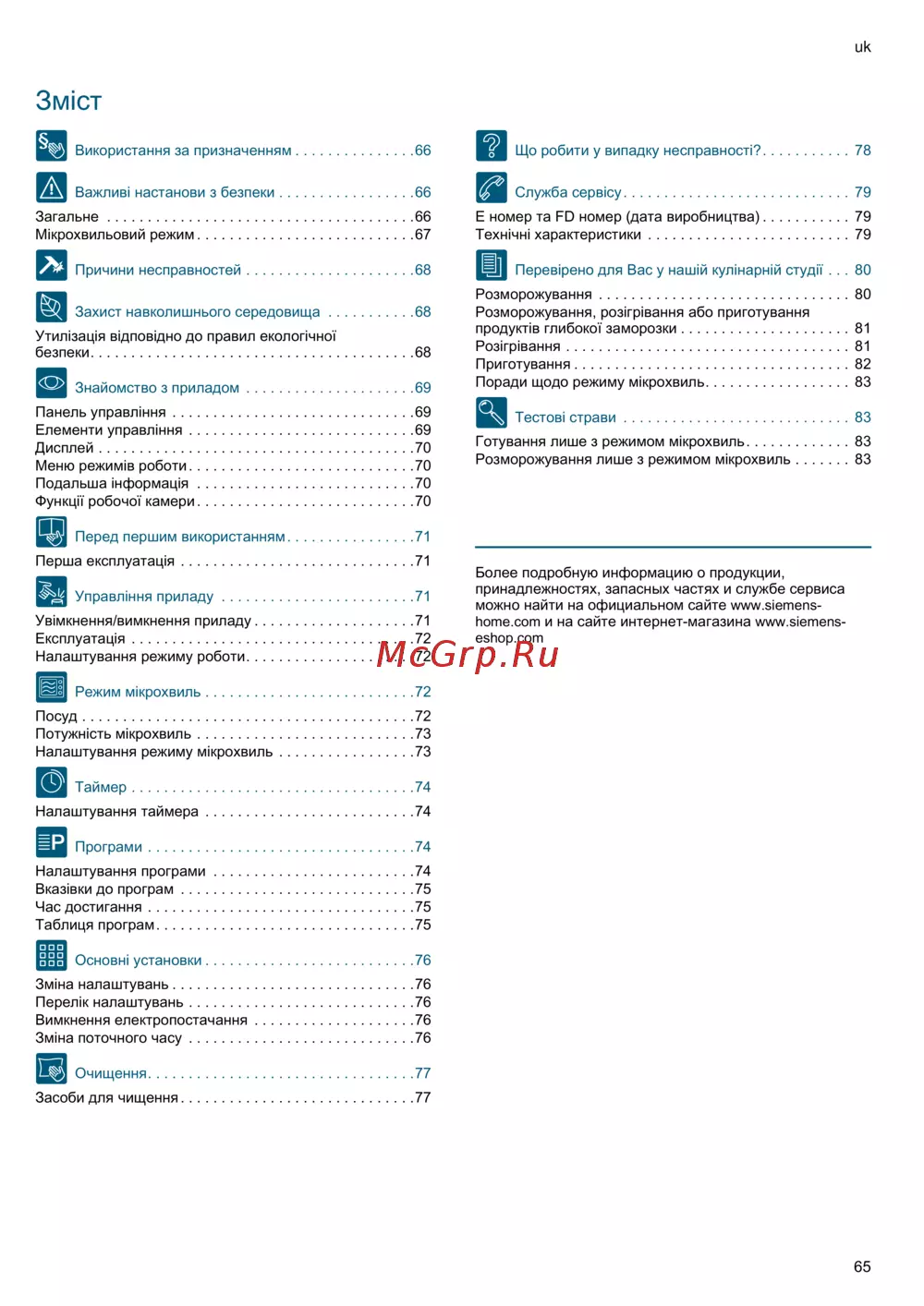 ик Змют Використання за призначенням 66 Що робити у випадку Важлив настанови з безпеки 66 Служба сервюу 79 Загальне 66 Мжрохвильовий режим 67 Е номер та ЕС номер дата виробництва 79 Техн чн характеристики 79 Причини несправностей 68 Захист навколишнього середовища 68 Утил зац я вщповщно до правил еколопчно безпеки 68 Знайомство з приладом 69 Панель управлння 69 Елементи управлшня 69 Дисплей 70 Меню режим в роботи 70 Подальша нформащя 70 Функцп робочоТ камери 70 несправност 78 Перев рено для Вас у наш й кул нарн й студи 80 Розморожування 80 Розморожування роз гр вання або приготування продукте глибокоТ заморозки 81 Роз гр вання 81 Приготування 82 Поради щодо режиму м крохвиль 83 Тестов страви 83 Готування лише з режимом м крохвиль 83 Розморожування лише з режимом мжрохвиль 83 Перед першим використанням 71 Перша експлуатащя 71 71 Ув мкнення вимкнення приладу 71 Експлуатащя 72 Налаштування режиму роботи 72 Более подробную информацию о продукции принадлежностях запасных частях и службе сервиса можно найти на официальном сайте www siemenshome com и на сайте интернет магазина www siemenseshop com Режим мжрохвиль 72 Посуд 72 Потужнють м крохвиль 73 Налаштування режиму мжрохвиль 73 О Таймер 74 Налаштування таймера 74 Програми 74 Налаштування програми 74 Вказ вки до програм 75 Час достигання 75 Таблиця програм 75 Основы установки 76 Зм на налаштувань 76 Перелж налаштувань 76 Вимкнення електропостачання 76 Зм на поточного часу 76 Очищения 77 Засоби для чищення 77 65