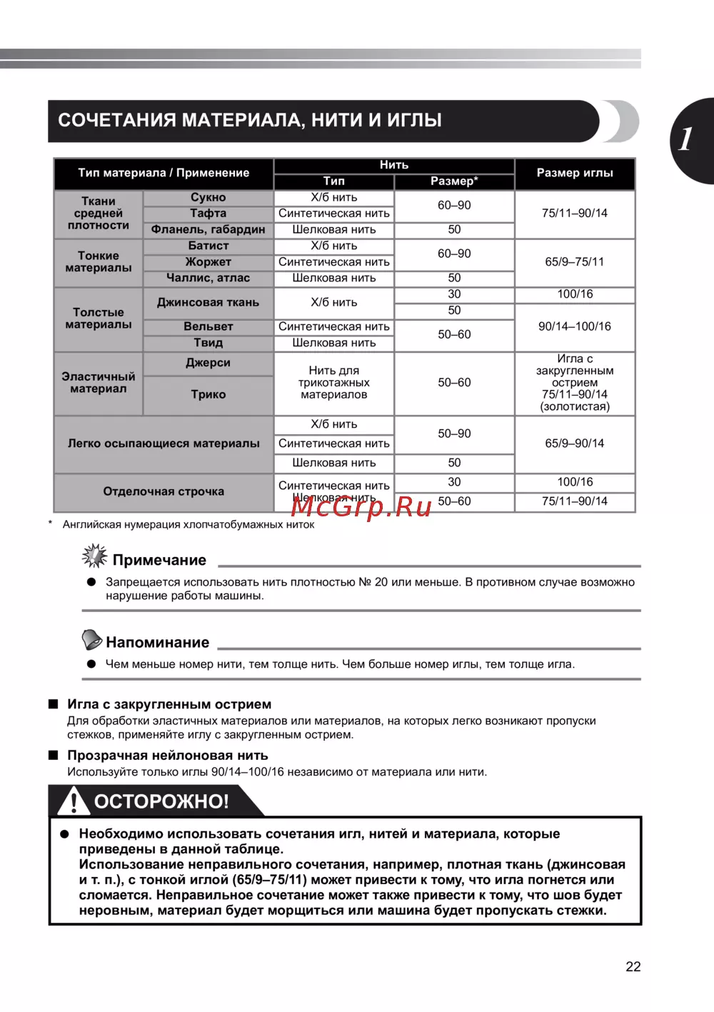 ● Необходимо использовать сочетания игл, нитей и материала, которые